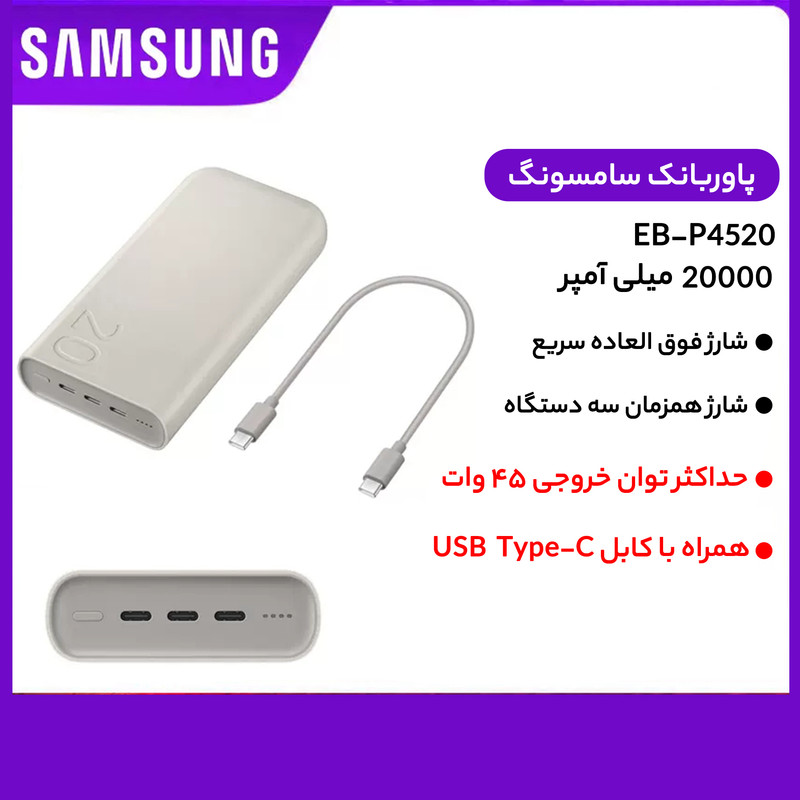 پاوربانک سامسونگ EB-P4520 با ظرفیت بالا، فناوریهای شارژ سریع و قابلیت شارژ همزمان چند دستگاه، انتخابی ایدئال برای کاربرانی است که به دنبال یک پاوربانک قدرتمند، مطمئن و باکیفیت هستند.