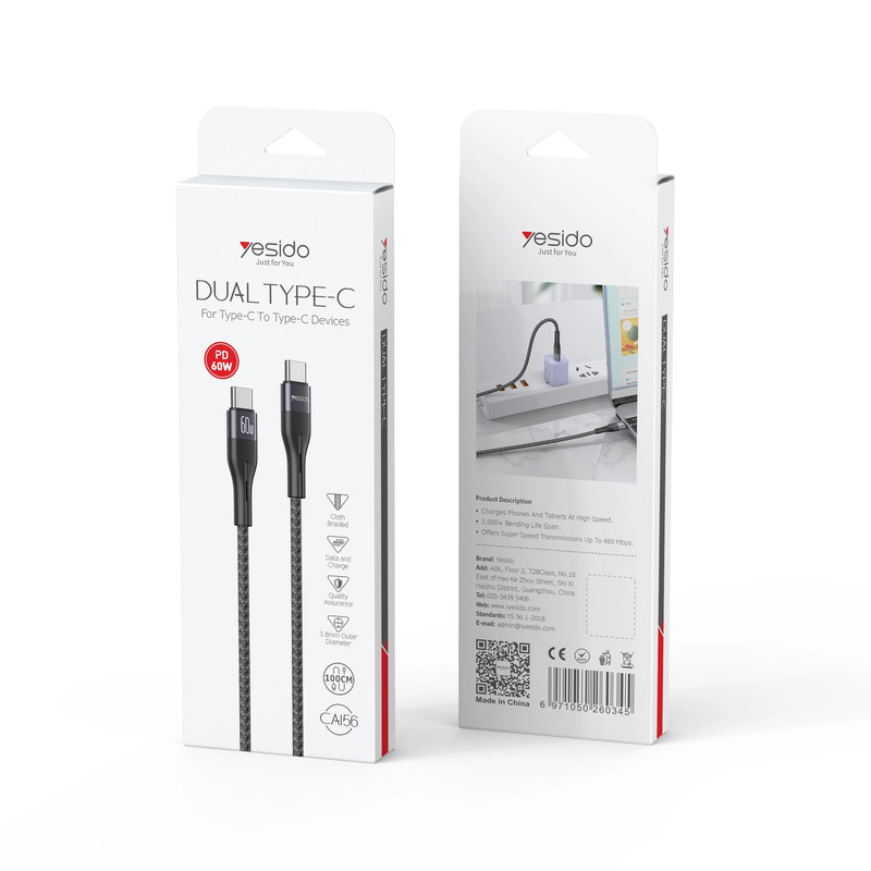 با پیشرفت تکنولوژی همچنان کابل ها ایمن ترین و سریع ترین راه برای شارژ و انتقال اطلاعات برای گوشی های همراه می باشد. کمپانی خوش نام Yesido با ساخت کابلی با کیفیت این امکان را برای کاربران خود به وجود آورده تا بتوانند به راحتی گوشی همراه خود را با سرعت بالا و با اطمینان خاطر شارژ کرده و به انتقال اطلاعات میان دو گوشی موبایل و یا لپتاپ نمایند. کابل Yesido DUAL TYPE-C CA156 60W به شما این امکان را می دهد تا بتوانید گوشی موبایل خود را با قدرت 60 وات شارژ کنید که سرعت مطلوبی برای شارژ محسوب می شود. طول این کابل 100 سانتی متر بوده که برای استفاده های روزمره بسیار مناسب می باشد.با استفاده از این محصول می توانید میان دیوایس های خود و یک موبایل یا لپ تاپ مجهز به پورت Type-C به انتقال اطلاعات با سرعت بالا بپردازید. کمپانی یسیدو برای جلوگیری از گره خوردن ، کشش و پارگی این کابل بر روی آن روکشی از الیاف در هم تنیده کشیده ، که علاوه بر مقاومت بالا ، باعث زیبایی آن هم شده است. این کابل به شما این امکان را هم می دهد تا بتوانید به راحتی علاوه بر شارژ ، اطلاعات خود را هم با سرعت بالا انتقال دهید. در ادامه سوکت های این محصول دارای پوشش آلومینیومی جهت حفاظت در برابر ضربه و قسمتی سیلیکونی جهت حفاظت در برابر تا شدن قرار داده شده است تا آسیبی به آن وارد نشود.