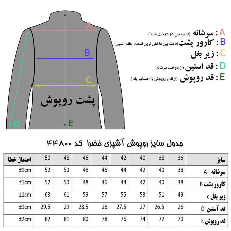 روپوش آشپزی خضرا کد 44800 در شرکت تبیان طب دیبا رازی طراحی و تولید شده است . پارچه این محصول کجراه می باشد . از ویژگی های این محصول عدم ایجاد حساسیت و عدم تعریق و وزن کم و ثبات رنگ پارچه میباشد. پارچه کجراه کمی ضخیم تر از پارچه ترگال و تترون میباشد که باعث افزایش عمر روپوش در برابر روپوشهای ترگال و تترون میگردد .برای انتخاب سایز مناسب ، یک روپوش قدیمی را از پشت اندازه گیری کنید و با جدول راهنمای سایز که در تصاویر روپوش قرار داده شده مقایسه کنید .دقت کنید حتما براساس جدول ، سایز خودتان را انتخاب کنید و سایز روپوش ، بامدل یا برند دیگر را معیار انتخاب سایز قرار ندهید . کالایی که دریافت میکنید دارای مارک های دوخته شده (خضرا) می باشد و بر روی هر محصول نام و کد وسایز و جنس پارچه ، درج شده است .