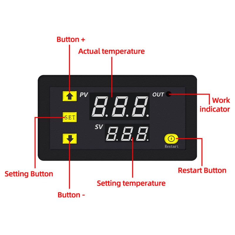 ترموستات w3230 با بازه دمایی -55 تا 120 درجه سانتیگراد قابل استفاده در دستگاه جوجه کشی ، گلخانه ، مرغداری ، اکواریوم ، یخچال و ... میباشد. این ترموستات دارای دو مود کاری سرمایشی یا گرمایشی قابل استفاده است.برای تنظیم ترموستات برای بار اول دکمه set را 5 ثانیه فشار دهید و گزینه ها را با توجه به نیاز خود سفارشی سازی کنید.برای تنظیم دما دکمه set را فشرده و رها کنید سپس با دکمه های بالا و پایین دما را کم یا زیاد کنید.