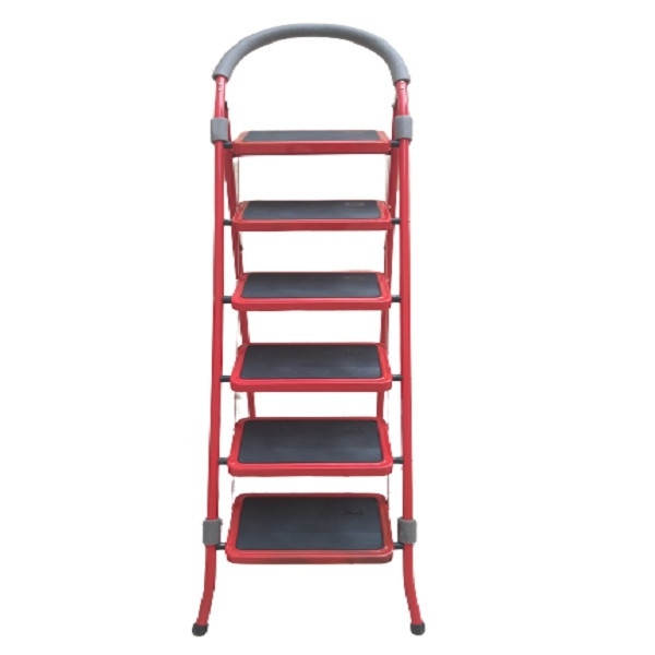 نردبان شش پله، مدل الماس میباشد.برای راحتی افراد، بر روی پلهها از روکش پلاستیکی استفاده شده، که این امکان را میدهد تا بدون کفش و حتی در منزل استفاده شود.شکل پایه طوری طراحی شده که تعادل نردبان بهتر حفظ شود. تاشو بودن محصول باعث میشود که فضای کمی را اشغال کند. از مزایای مهم دیگر این نردبان، پوشش رنگی الکترواستاتیک است که در برابر رطوبت و زنگ زدگی و خوردگی مقاوم میباشد. تمام اتصالات بدنه پیچ و مهره است و بدون پرچ میباشد به همین دلیل بسیار محکم است چون پرچ آلومینیومی میشکند.