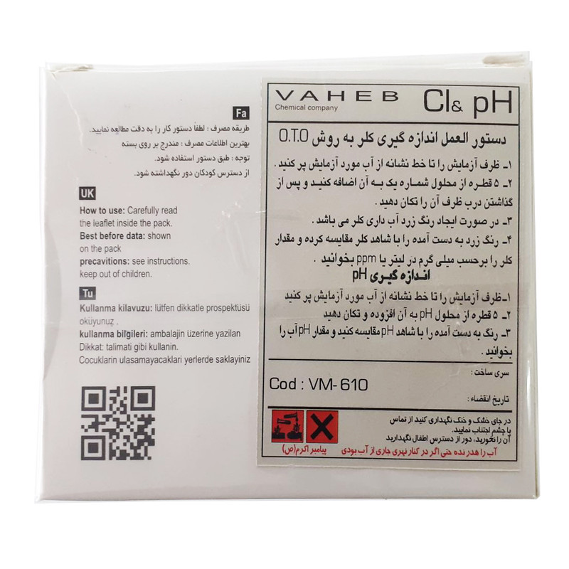 کیت اندازه گیری کلر و PH واهب مدل VM-610 میتواند برای تعیین غلظت کل کلر و همچنین میزان ph آب استفاده شود. این محصول ساخت کشور ایران است.