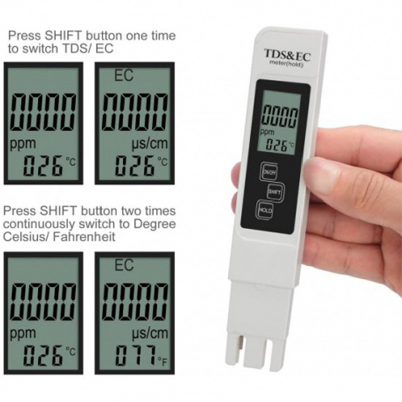 سختی سنج TDS و EC متر (قابلیت اندازه گیری هدایت الکتریکی) آب به همراه دماسنج، یک نمونه قابل اعتماد خانگی است که دقت آن برای اندازه گیری های خانگی قابل قبول است.