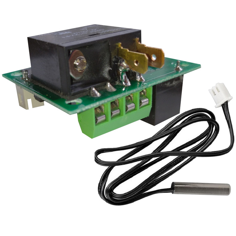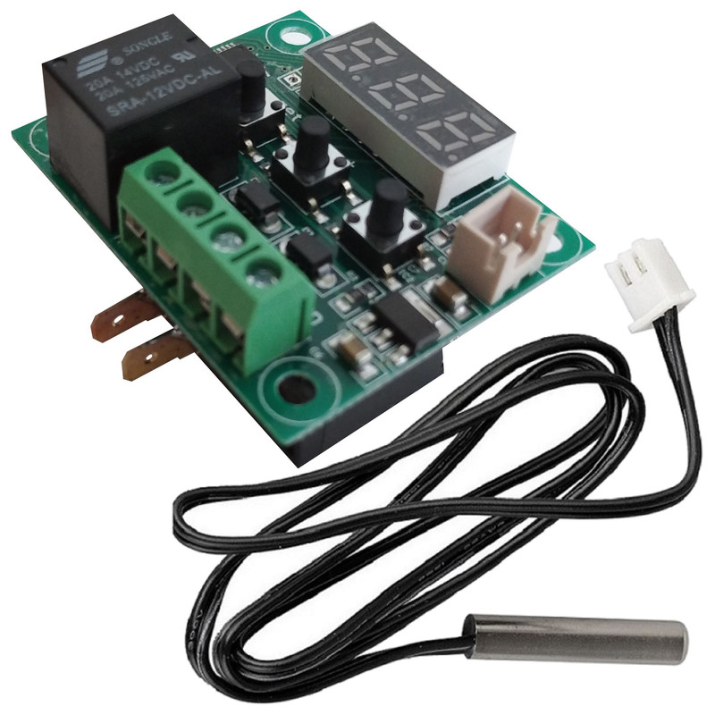 ترموستات تقویت شده مدل XH-W1209 همان ترموستات 1209 است تنها با این تفاوت که توسط یک عدد رله 16 آمپر از پشت برد به آن متصل و تقویت شده است و براحتی مصرف کننده ای تا توان 2000 وات را پشتیبانی خواهد کرد. این در حالی است که رله اصلی خود ترموستات برای کارکرد ایده آل و عمری تا 100 وات بیشتر مورد اعتماد نیست و چون خرابی رله ترموستات تلفات زیادی را متوجه مشتری خواهد کرد بهتر است که از ترموستات تقویت شده مدل XH-W1209 در دستگاه ها (خصوصا دستگاه جوجه کشی) در توان های بالای 100 وات تا 2000 وات استفاده کرد.جهت کنترل دما باید قسمت استیل سنسور سیم دار ضد آب را در جایی که قرار است دمای آن کنترل شود قرار داد. نحوه تنظیم ترموستات برای دستگاه جوجه کشی (یکبار برای همیشه): کلید set را پنج ثانیه نگه میداریم پس از رها سازی، نمایشگر عبارت P0 را نشان می دهد در این حالت مجددا دکمه set را یکبار میزنیم در این حالت نمایشگر عبارت C (یعنی حالت کولر جهت استفاده بعنوان کنترلر یخچال هایی که بردشان سوخته است) را نشان میدهد و با زدن دو دکمه دیگر (+ و -) عبارت H (یعنی حالت هیتر و گرمایش) را روی نمایشگر می بینیم در این حالت دکمه set را می زنیم و با دکمه + عبارت P1 را روی نمایشگر پیدا می کنیم و در این حالت با زدن کلید set وارد تنظیمات P1 می شویم و عدد 2 را می بینیم سپس باکلید - آنقدر عدد 2 را کم می کنیم تا به عدد 0.1 برسد (یعنی بازه ی قطع و وصل بجای دو درجه یک دهم درجه باشد تا حداکثر دقت و حداقل نوسان حاصل شود) سپس کلید set را میزنیم و با مشاهده P1 مجددا set را به مدت پنج ثانیه نگه میداریم سپس رها می کنیم. نحوه تنظیم ترموستات برای یخچال (حالت خنک کننده - یکبار برای همیشه): مانند تنظیمات دستگاه جوجه کشی با این تفاوت که باید P0 در حالت C و P1 روی 5 تنظیم شود و همچنین P5 روی 6 تنظیم شود (یعنی تاخیر در وصل به مدت 6 دقیقه - بدون نیاز به نصب محافظ برای یخچال با این تنظیم). نحوه تنظیم دما: ابتدا دکمه set رو بفشارید و بعد از چشمک زدن نمایشگر با دو دکمه دیگر ( + و - ) دما را کم یا زیاد کنید (برای دستگاه جوجه کشی 37.5 و برای یخچال در صورتی که سنسور درون جایخی است عدد منفی 10 و در صورتی که سنسور بیرون جایخی است عدد 10 یا کمی بیشتر را انتخاب کنید) سپس دکمه set را مجددا بفشارید.