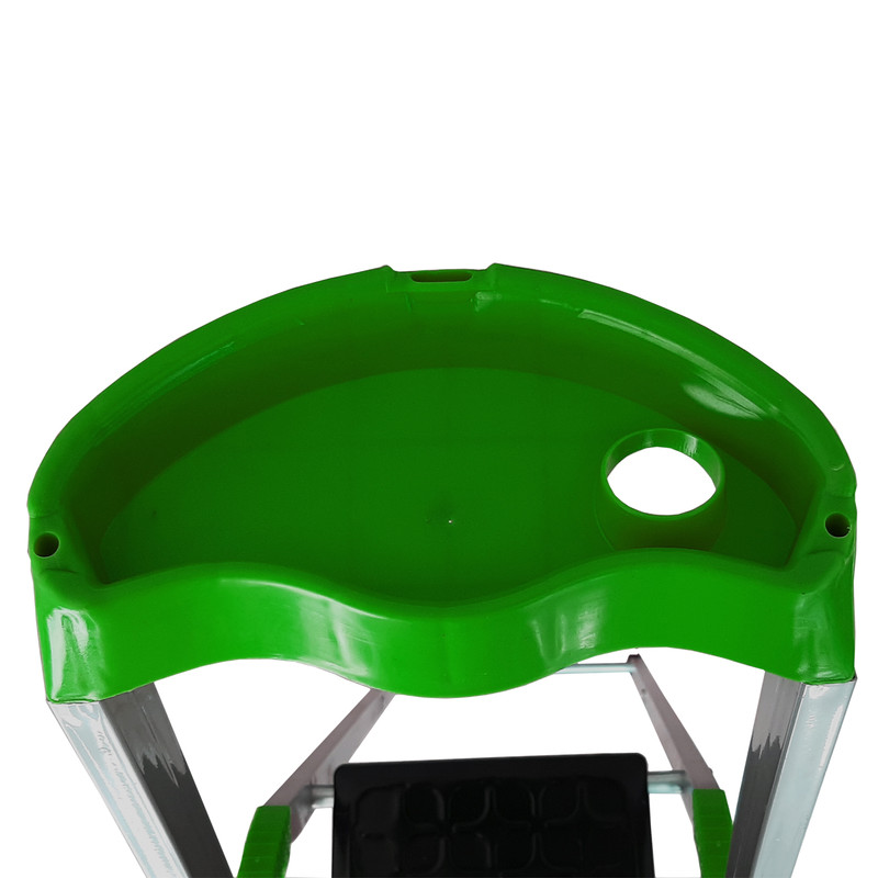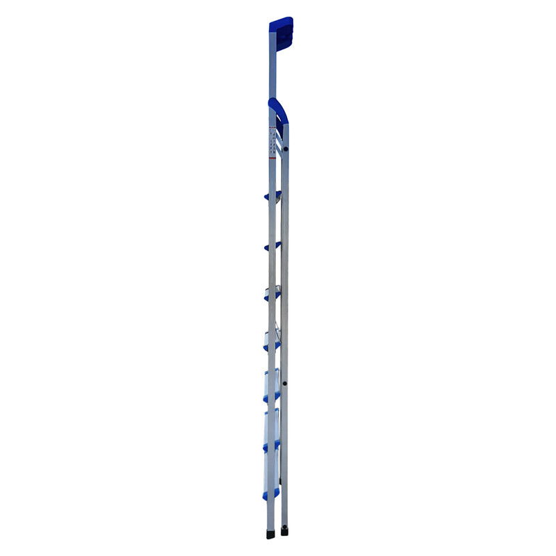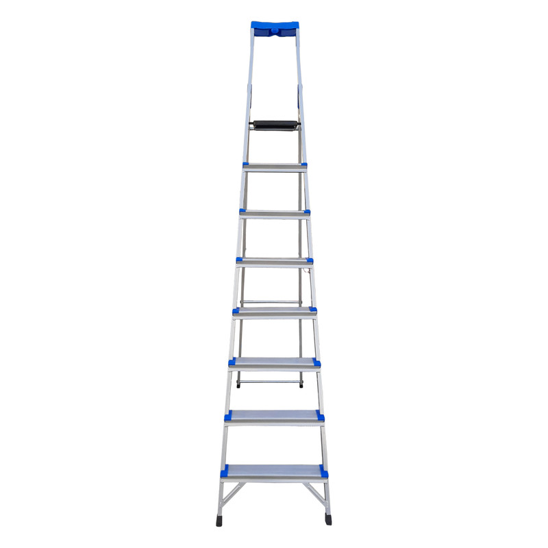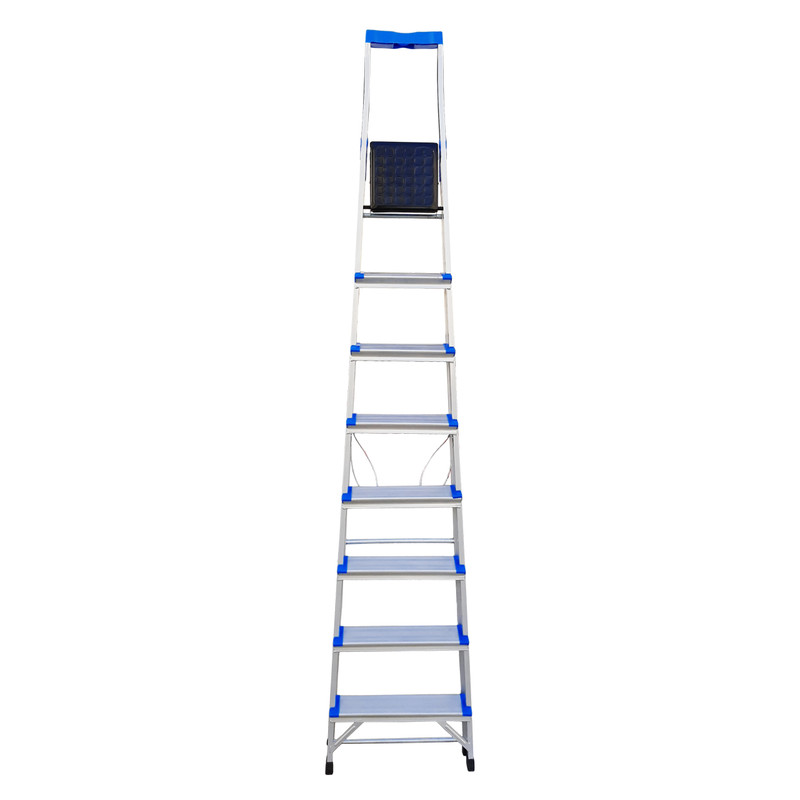 نردبان 8 پله مدل کیهان با استفاده از پروفیل مقاوم تحمل وزنی بیش از 150 کیلو را برای فرد میسر ساخته است. این نردبان نسبت به نردبان های هم رده ی خود با همین تعداد پله از بیشترین ارتفاع در پله آخر برخوردار است که ارتفاع آن در حالت باز شده از زمین تا آخرین پله معادل 215 سانتی متر می باشد. رنگ این نردبان الکترواستاتیک است و از جوش CO و از سیم فولادی در کناره های بدنه، برای استحکام بیشتر نردبان استفاده شده است. پله ی بالایی این نردبان پهن تر از سایر پله ها بوده که استفاده ی طولانی مدت را برای فرد راحت تر می سازد. بیشتر ما زمانی که از نردبان استفاده میکنیم، در صورت نیاز داشتن به ابزار مختلف یا از فردی دیگر درخواست کمک میکنیم و یا خود مجبور به پایین رفتن از نردبان میشویم. اما نردبان پنج پله کیهان با داشتن یک سینی پلاستیکی مخصوص ابزار در قسمت بالای خود، این مشکل را رفع کرده و زمان انجام کار را کاهش می دهد.