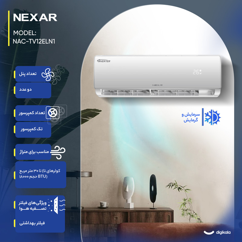 کولر گازی اسپلیت دیواری نکسار مدل NAC-TV12ELN1_NAC-TV12ELU1 دارای یک کمپرسور روتاری و پنل واحد است که با برد الکترونیکی اینورتر فعالیت میکند. این دستگاه برای اقلیم معتدل و ظرفیت ۱۲۰۰۰ بیتییو طراحی شده و قابلیت سرمایش و گرمایش دارد. ریموت کنترل مجهز به نمایشگر دیجیتال بوده و امکانات تنظیم دما، فن، تایمر، حالت خواب، حالت توربو و جهت پرتاب باد از راه دور را در اختیار کاربر قرار میدهد.