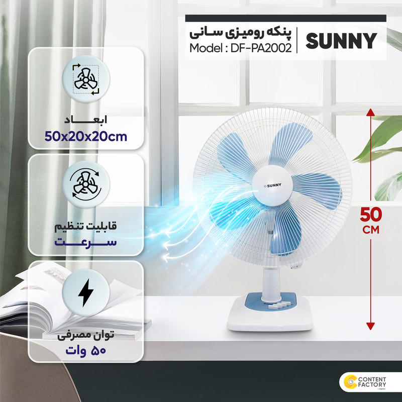 امروزه پنکههای سنتی همچنان در بین خانوادههای ایرانی محبوب هستند و میتوان کمتر کسی را پیدا کرد که یکی از این وسیلههای پرکاربرد را در خانهی خود نداشته باشد. پنکه سانی مدل DF-PA2002 هم از این نوع کالاهای سرمایشی اما در ظاهری جدید است که با وجود موتوری پرقدرت و 5 پرهی پلاستیکی در ساختار خود گردش هوای ایدئالی را در محیط به وجود آورد. این نوع پنکهی رومیزی وزنی به اندازهی 4 کیلوگرم و ابعادی به اندازهی 20x20x50 سانتیمتر دارد اما گردن آن قابلیت تنظیم ارتفاع ندارد. همچنین این مدل پنکهی سانی دارای ریموت کنترل نیست اما میتوان سرعت آن را در سه حالت کم، متوسط و تند کنترل کرد. البته لازم است بدانید که در حالت تند میزان صدای پنکه بالاتر از حالت عادی آن میرود به همین علت هم این محصول گزینهای مناسب برای استفاده در اتاق خوابها نیست.