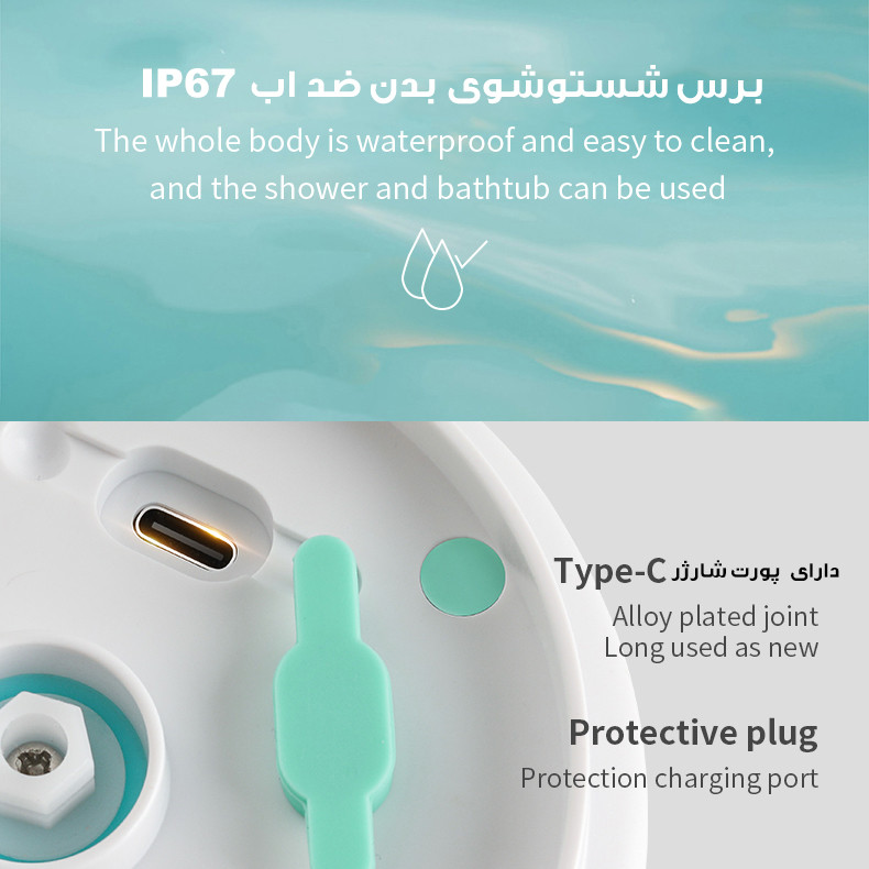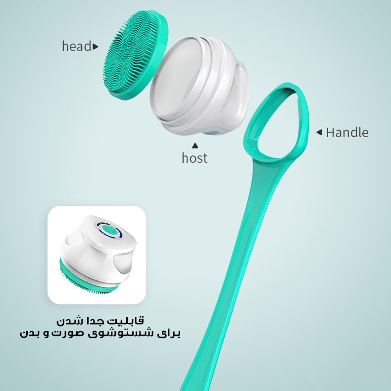 سایر توضیحات : برس شستوشوی بدن برقی شامل 5 سری مختلف با کارایی متفاوت : سر سیلیکونی برای شستوشوی صورت و .... کاملا نرم و ملایم سری دیگر برای ماهیچه های سفت سنگ پا برای پینه ها و پوست های سفت سر پاک کننده با برس های نرم برای شستشوی روزانه و ... با قدرت 10 وات و IP67