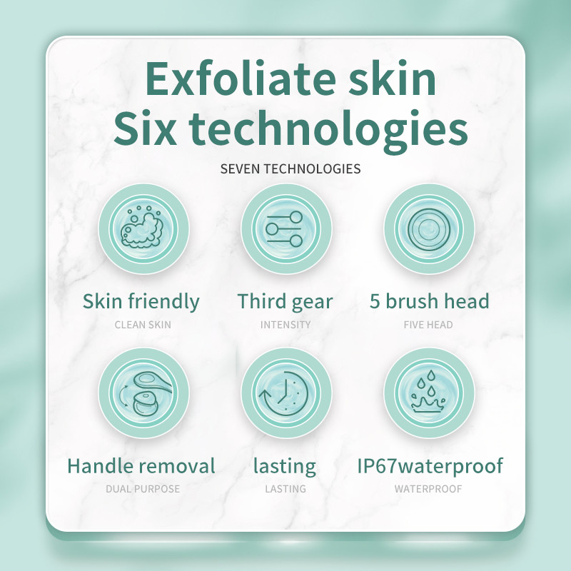 برس شستوشوی بدن برقی شامل 5 سری مختلف با کارایی متفاوت : سر سیلیکونی برای شستوشوی صورت و .... کاملا نرم و ملایم سری دیگر برای ماهیچه های سفت سنگ پا برای پینه ها و پوست های سفت سر پاک کننده با برس های نرم برای شستشوی روزانه و ... با قدرت 10 وات و IP67