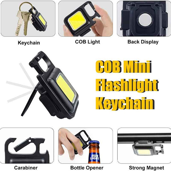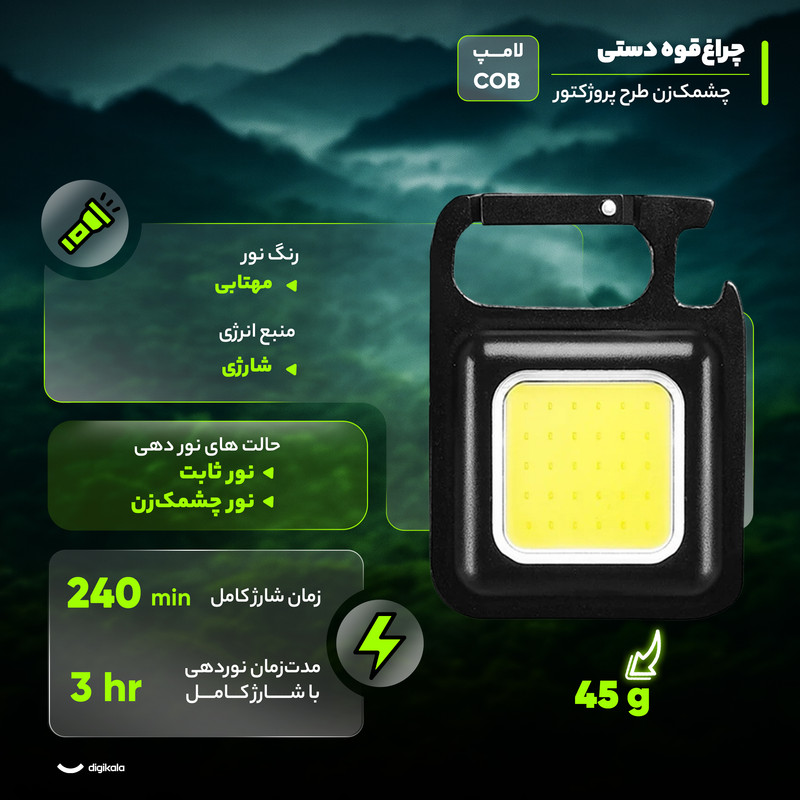چراغقوه جیبی مدل چشمکزن چندکاره COB یک وسیله با چند کارایی جالب است. جنس بدنه چراغکار آلیاژ آلومینیوم و مقاوم در برابر ضربه است. چراغقوهای که میتوان به آن چراغ جیبی هم گفت، دارای 4 حالت نوردهی قوی، ضعیف و چشمکزن و با فشردن دکمه پاور به مدت 3 ثانیه نور بسیار قوی آن نیز روشن میشود. چراغقوه مینی چندکاره COB دارای وزن با بستهبندی 60 گرم و ابعاد 6.5x4.5 سانتیمتر است که در عین کوچک بودن، بسیار کاربردی و مفید است. چراغقوه چندکاره COB دارای میزان روشنایی 800 لومن و محدودهی نوردهی 30 تا 50 متری است و دارای ویژگیهای دیگری چون: پایه نگهدارنده قابل چرخش تا زاویه 180 درجه، جاکلیدی، قوطی بازکن و مگنت برای نصب بروی سطوح است. منبع تغذیه چراغقوه مینی چندکاره COB توسط کابل تایپ C است.
