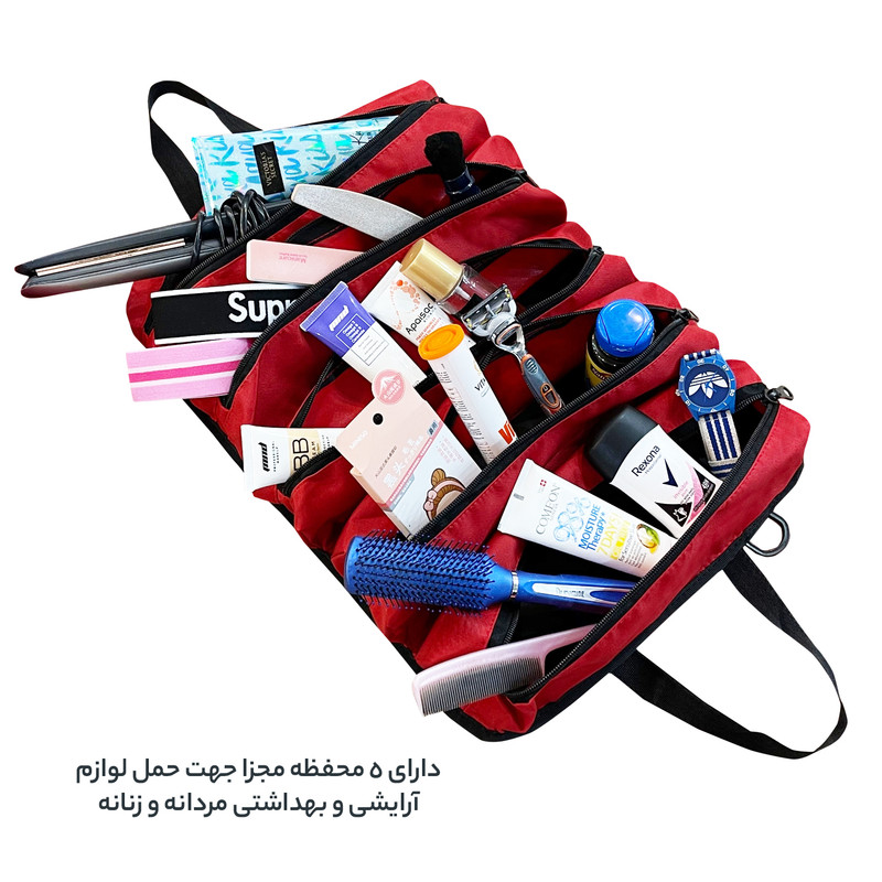 دارای 5 محفظه زیپی مجزا جهت استفاده به عنوان کیف لوازم شخصی مردانه و زنانه و قابل استفاده به عنوان کیف ابزار