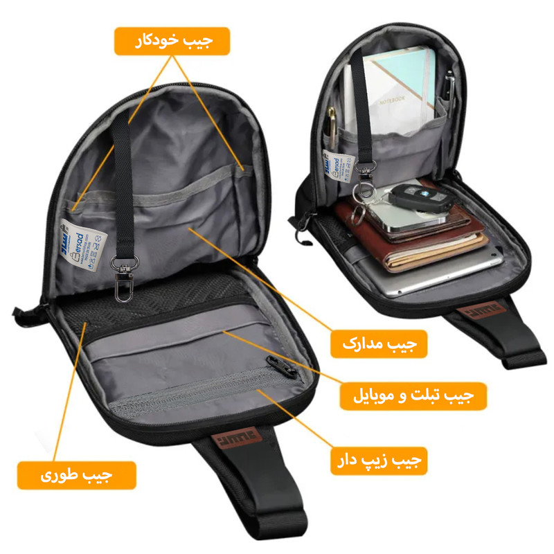 محفظه‌ها : جیب بیرونی , جیب خودکار , جیب داخلی , دارای یک محفظه اصلی , محفظه نگهداری تبلت