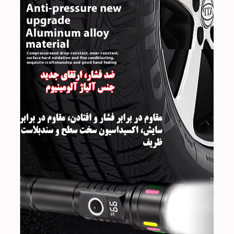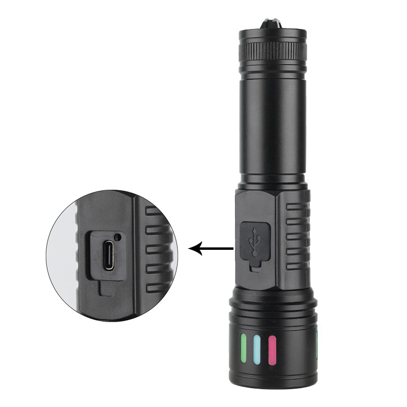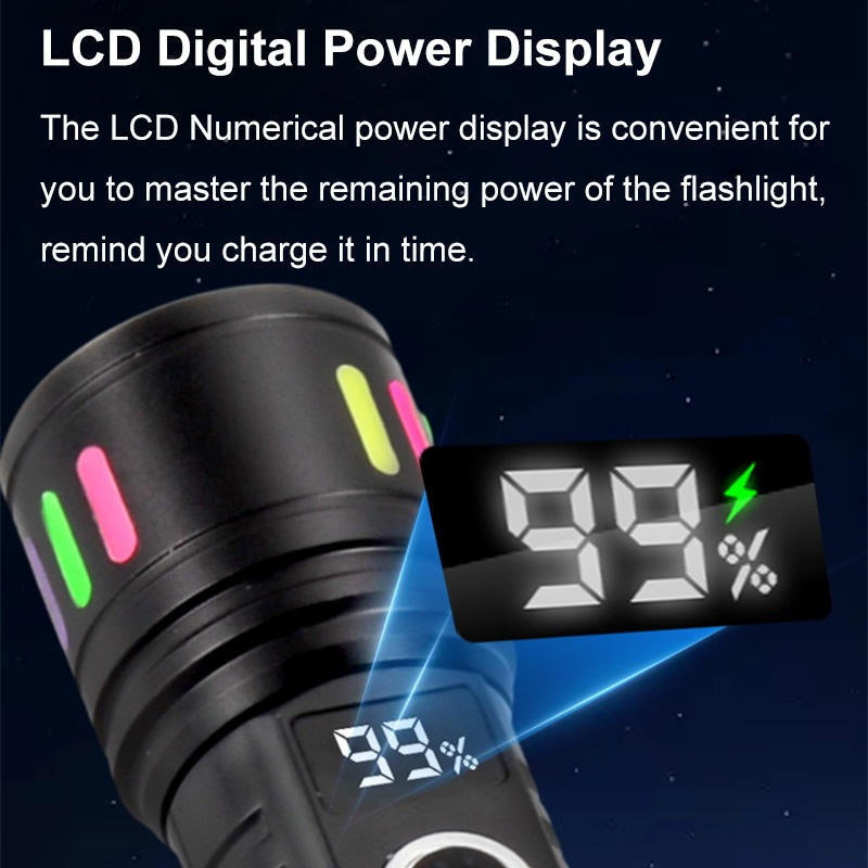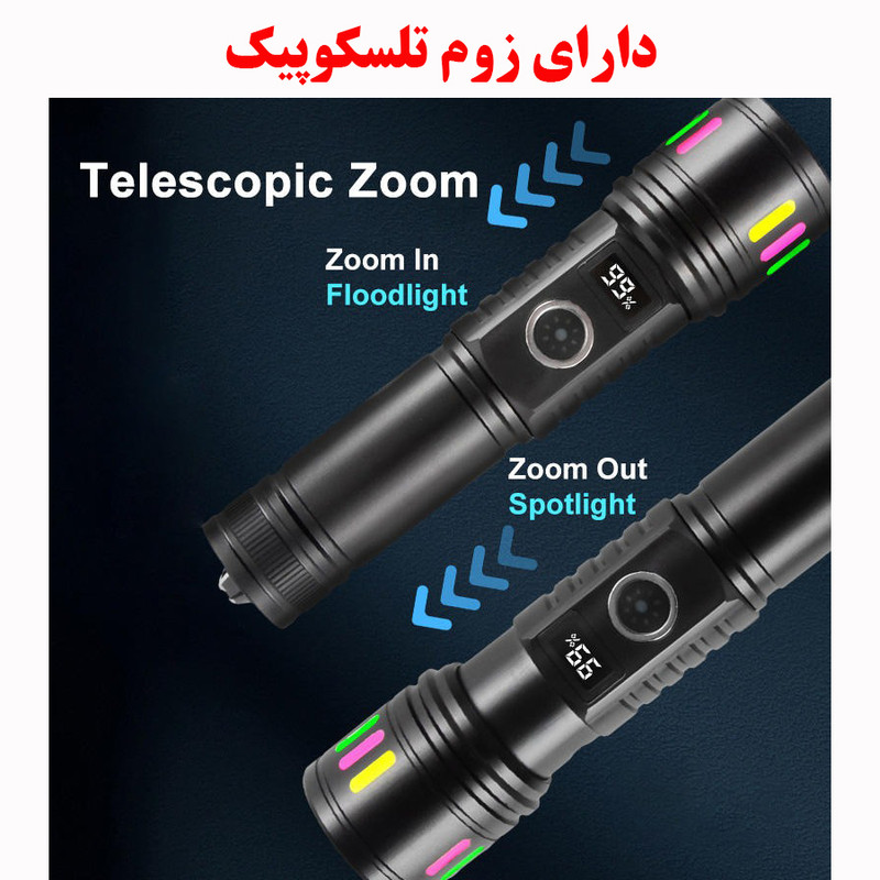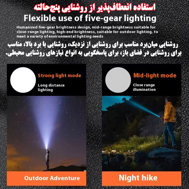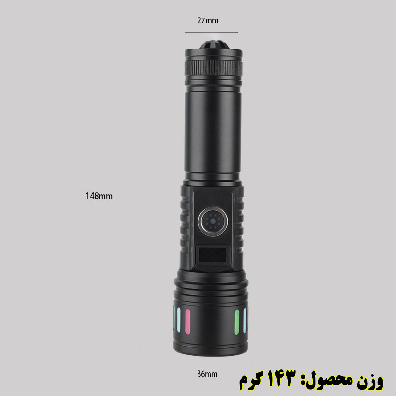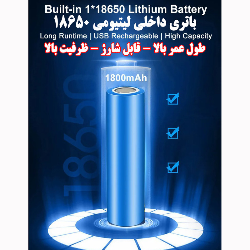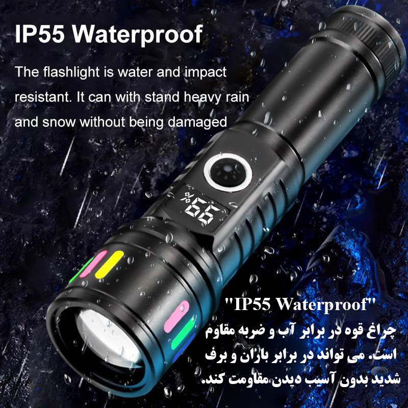 صفحه نمایش دیجیتال LCD، میزان شارژ باتری لیتیومی 18650 داخلی را به صورت درصد نشان میدهد. باتری با ظرفیت بالا، امکان استفاده طولانی مدت (3 تا 12 ساعت بسته به نوع استفاده) را فراهم میکند و از طریق درگاه Type-C به سرعت شارژ میشود. علاوه بر این، چراغ قوه ضدآب با استاندارد IP55 بوده و در برابر باران و برف شدید مقاوم است.