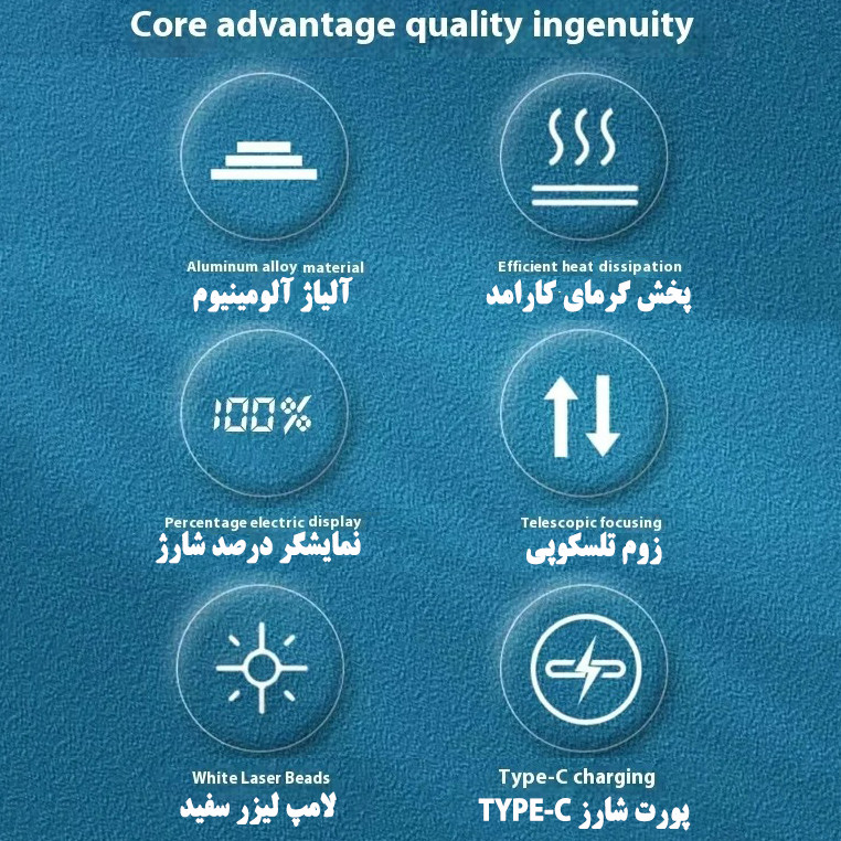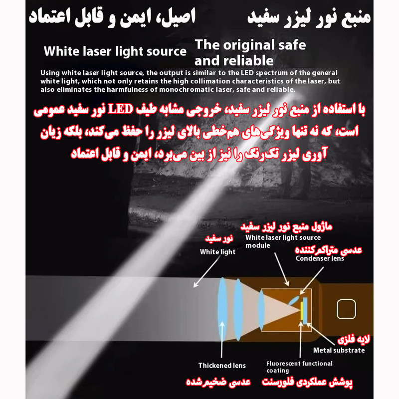 در قلب این چراغ قوه، یک لامپ لیزر سفید با توان فوقالعاده و روشنایی 1000 لومن قرار دارد که نوری شفاف و قوی را برای مسافتهای دور و نزدیک فراهم میکند. فناوری لیزر سفید نه تنها ویژگیهای هم خطی نور لیزری را حفظ کرده، بلکه با از بین بردن مضرات لیزر تک رنگ، ایمنی و اطمینان را تضمین می کند. چراغ قوه دارای پنج حالت روشنایی (قوی، متوسط، ضعیف، چشمک زن و SOS) است که به کاربر اجازه میدهد متناسب با نیاز خود نور را تنظیم نماید. با قابلیت زوم تلسکوپی می توانید نور را به صورت متمرکز (نقطه ای) برای مسافت های دور یا به صورت پخش (پروژکتوری) برای پوشش وسیع تر تنظیم کنید.