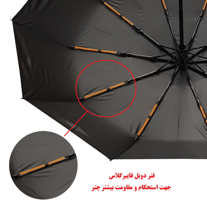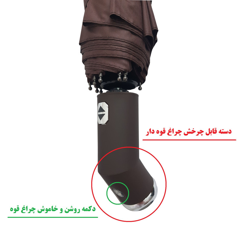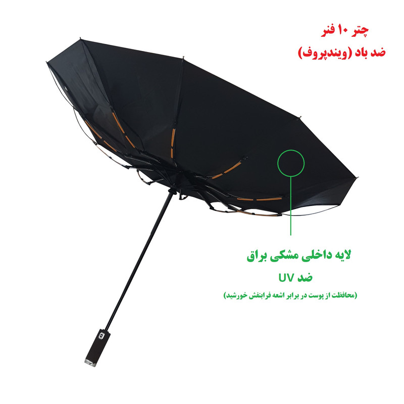 چتر چراغ قوه دار تمام اتوماتیک، 10 فنر دوبل، ضد باد و پارچه دو لایه ضد اشعه مضر UV خورشید بهترین گزینه برای خرید چتر می باشد. در این چتر از 10 فنر دوبل مستحکم فایبر گلاس که در تصاویر آلبوم نیز مشخص است استفاده شده است که همین امر باعث مقاومت آن در زمان وزش شدید باد می شود و از آسیب رسیدن به چتر جلوگیری می کند. همچنین چراغ قوه دار بودن این چتر شرایط مناسبی را برای روشن کردن مسیر حرکت در شب های بارانی برای شما فراهم کرده است.