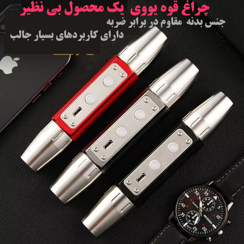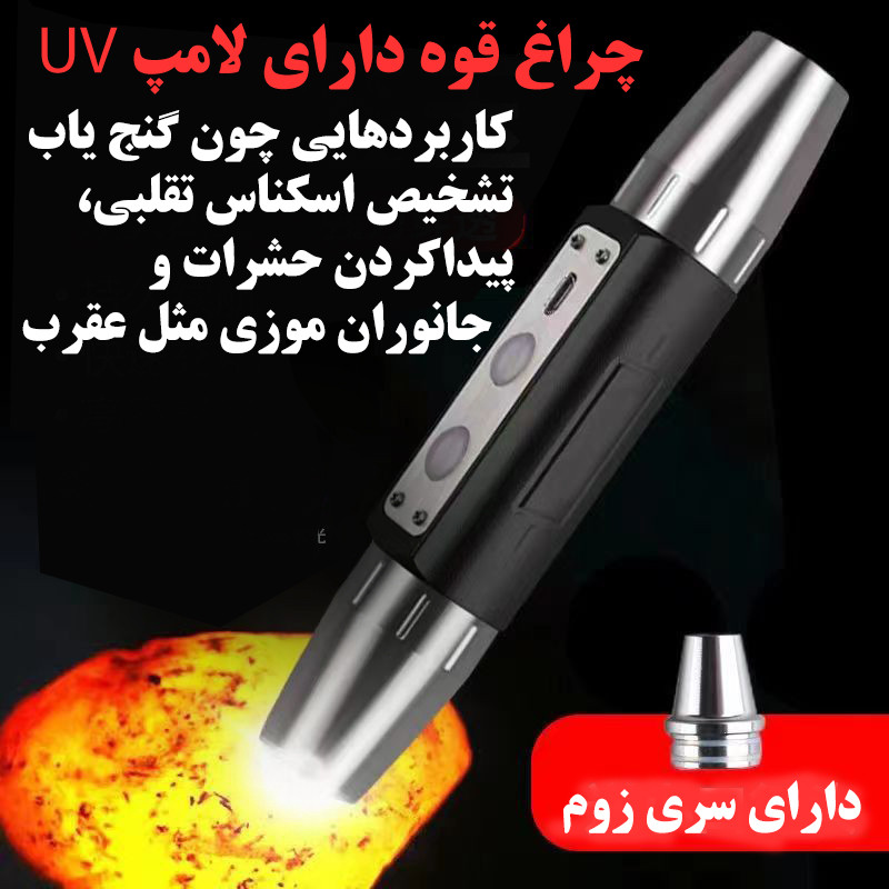 چراغ قوه UV یک محصول بی نظی که دارای کاربردهای بسیار جالب است. این چراغ قوه دارای جنس بدنه آلیاژ آلومینیوم، و مقاوم در برابر ضربه می باشد. چراغ قوه از 4 لامپ تشکیل شده است و این چهار لامپ با دو عدد دکمه پاور قابل روشن و خاموش شدن می باشد.