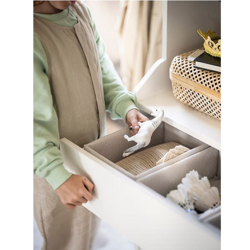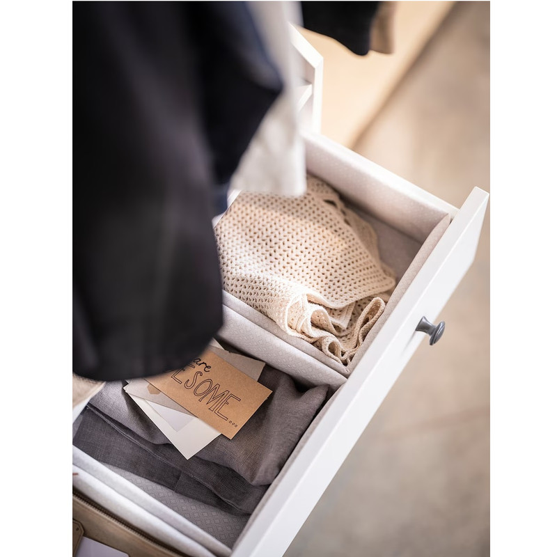 اندازه مناسب برای نگهداری کتانی، لباس زیر و چیزهایی مانند خودکار، کابل و سایر لوازم جانبی میز است.قسمت داخلی پارچه دارای طرحی تزیینی است که هر بار که کشو را باز می کنید حس زیبایی را به شما می دهد.طرح و بیان کاملاً با مبلمان سری HAUGA و IDANÄS مطابقت دارد، اما مطمئناً می توانید از آن در هر مبلمانی که دوست دارید برای سازماندهی و ساختار وسایل خود استفاده کنید.شستشوی آسان در ماشین - فقط به یاد داشته باشید که درج های پنهان شده زیر پارچه را بردارید.