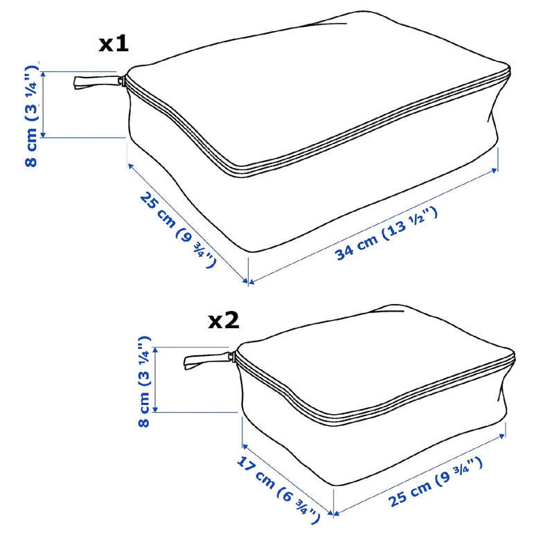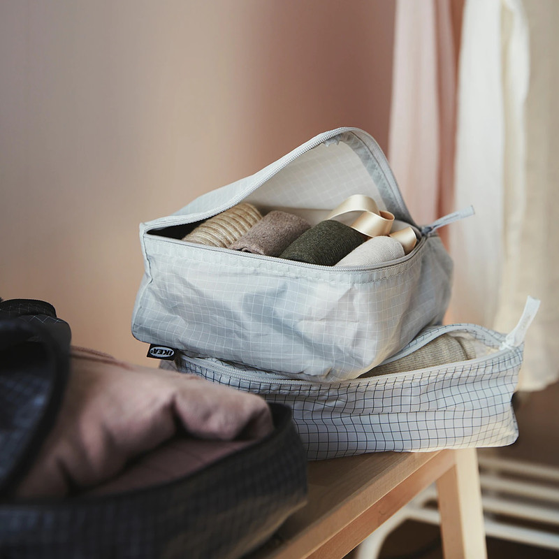 می توانید شلوار و تی شرت های خود را را در کیف بزرگ نگه دارید بنابراین اگر آنها را جمع کنید ، فضای بیشتری خواهید داشت و در کیف های کوچک همه چیز را از لباس زیر و جوراب گرفته تا هدفون جا دهید. این ست IKEA بسیار ایده آل برای لباس و سایر وسایل ضروری است که می خواهید در سفرهمراه خود داشته باشید. جنس این کیف ایکیا ساخته شده از پلی استر می باشد که با یک زیب با کیفیت بسته می شوند.
