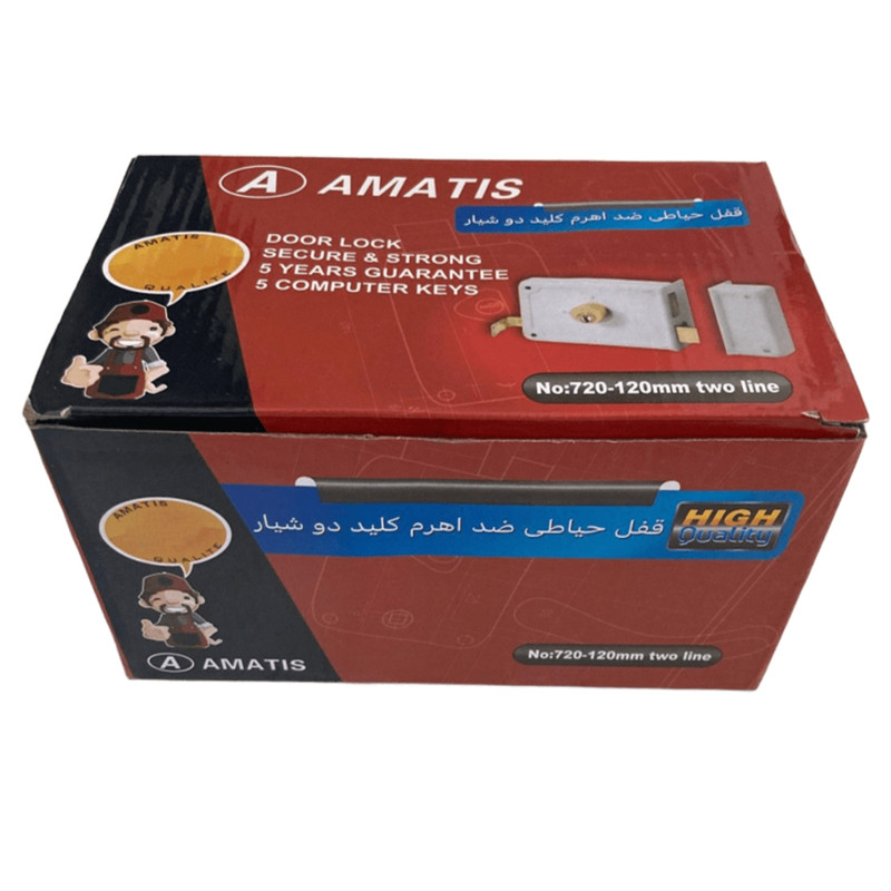 قفل حیاطی آماتیس قابل نصب بر روی انواع دربهای ورودی چوبی، آهنی و آلومینیومی در منازل، محیطهای کار، انبارها، باغها و... است. امتیاز برجستهٔ این قفل خارجی، پنج کلید بلند دو شیار آن است که امنیت خاطر را برای شما به همراه میآورد. زبانهٔ برنجی قفل حیاطی، تا سه پله بیرون میآید و مناسب دربهای چپ بازشو و راست بازشو است. همچنین رنگ زیبای این قفل، جلابخش محیط شما میباشد.