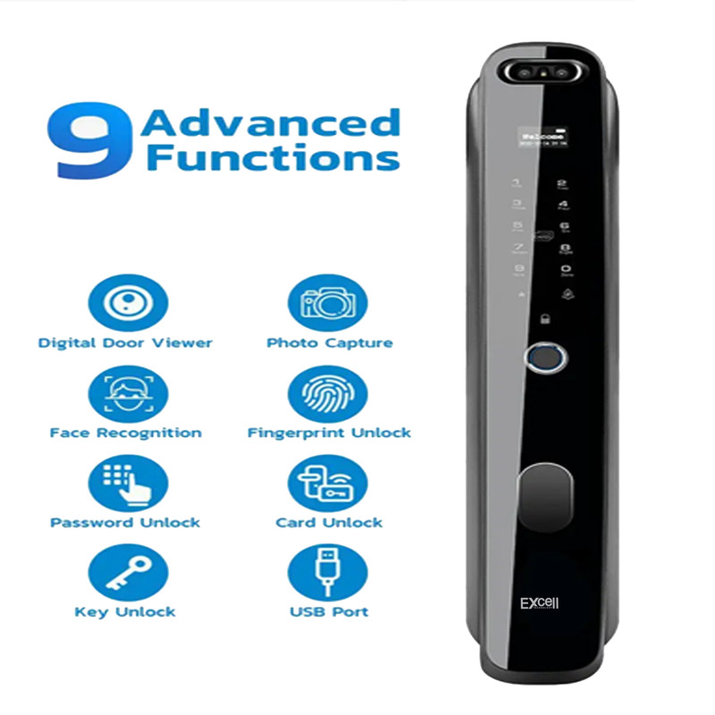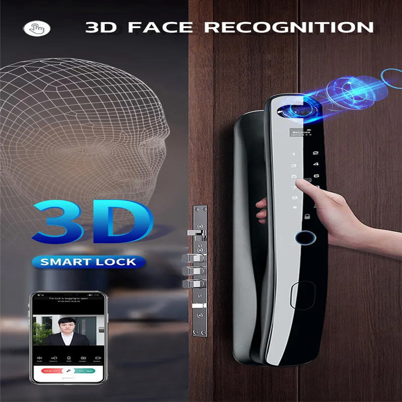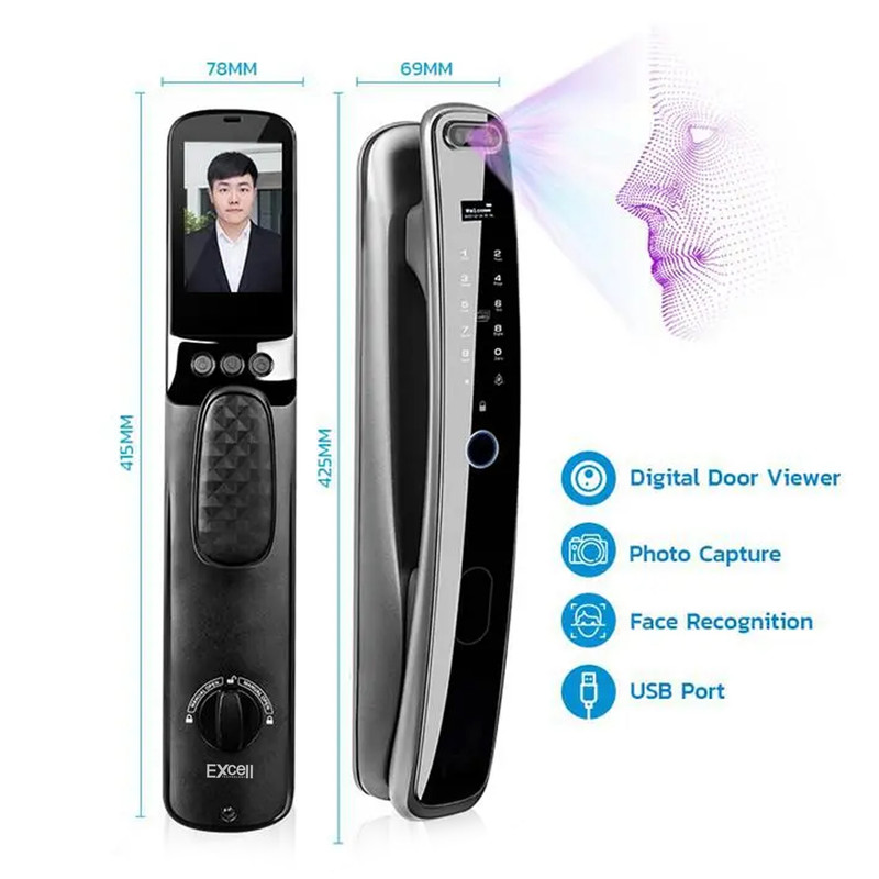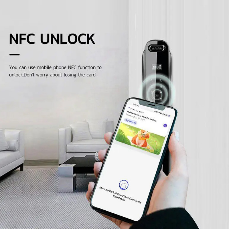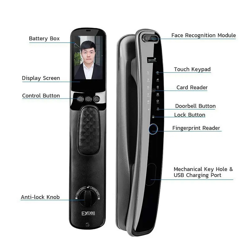 قفل دیجیتالی درب با دوربین با روش کارت + اثرانگشت + رمز عبور + کلید مکانیکی + کنترل برنامه + NFC + تشخیص چهره باز میشود . اندازه محصول 420x79x75mm و از مواد آلیاژ آلومینیوم تشکیل شده و منبع تغذیه باتری لیتیومی 7.4 ولتی 4200 میلی آمپر ساعتی، تا 182 روز زمان کار (باز کردن قفل 10 بار در روز) است و از امکانات : هشدار نادرست (پس از 5 باز کردن قفل نادرست، سیستم به طور خودکار به مدت 60 ثانیه قفل می شود) ، شارژ اضطراری USB ، حالت باز عادی ، رمز عبور مجازی ، زنگ باتری کم ، باز و بسته شدن درب اتوماتیک ، زنگ درب تصویری ، چشم گربه دوربین ، هشدار ضد دستکاری ، زمان مقایسه: ≤ 0.5sec ، دمای کاری: -20°- 60° ، کت و شلوار برای درب استاندارد: 40-120 میلی متر (ضخامت) ، ظرفیت 300 گروه / چهره + رمز عبور + اثر انگشت + مقدار ذخیره سازی کارت آی سی (طول رمز عبور: 6-10) می باشد . اندازه بسته بندی 480x140x240 میلی متر، 4 کیلوگرم است .