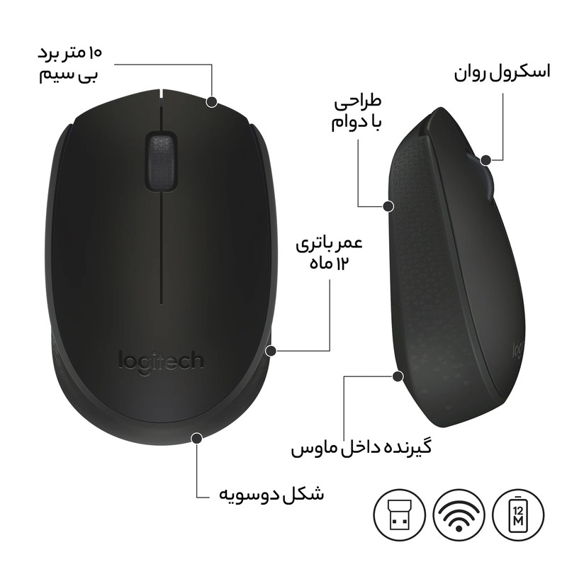 ماوس «M170» یک ماوس بیسیم است که از طریق فناوری وایرلس به دستگاه موردنظرتان متصل میشود و میتواند تا فاصلهی 10متری به شما خدمت کند و شما را از شر سیمهای اضافی نجات دهد. این ماوس بیسیم بسیار خوشدست است و از طراحی بسیار خوبی بهره میبرد؛ بهصورتیکه دستتان بسیار راحت و طبیعی روی آن قرار میگیرد و حتی پس از ساعتها کار طولانی با آن خسته نخواهد شد. این ماوس به دلیل ابعاد و طراحی هوشمندانهی خود، قابلیت استفاده بهوسیلهی دو دست را برای ما فراهم کرده است. ارتباط ماوس با رایانه به وسیلهی دانگل USB انجام میشود. فرکانس 2.4 گیگاهرتز و برد ماوس 10متری برای M170 یک مزیت بوده و دست شما را برای ارتباط بدون محدودیت باز گذاشته است. باتری موردنیاز برای این ماوس از نوع قلمی سایز AA است. علاوهبراین در قسمت زیرین این ماوس، دکمهای برای خاموش و روشنکردن ماوس وجود دارد که جهت صرفهجویی در مصرف انرژی کمک شایانی میکند. لاجیتک برای انتخاب راحتتر، M170 را در سه رنگ تولید کرده است. این محصول شباهت زیادی به محصول M171 دارد؛ اما در بخش طراحی بدنه و رنگهای عرضهشده متفاوت است.