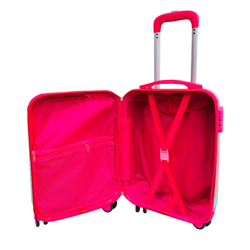 این محصول از جنس پلی کربنات انعطاف پذیر ساخته شده است که علاوه بر استحکام بالای آن وزن بسیار سبکی دارد و این وزن سبک و همچنین چرخ های دوبل و روان 360 درجه که قابلیت جدا شدن نیز دارند حرکت چمدان بر روی تمام سطوح را بسیار راحت کرده است. 2زیپ در داخل چمدان قرار دارد که یکی از زیپ ها توری است و برای نگهداری لوازم شخصی مناسب است. جهت جلوگیری از جابجایی وسایل داخل چمدان هم محفظه ی اصلی به یک کمربند ثابت کننده ی بار مجهز شده تا خیالتان بابت مرتب بودن وسایل سفر بر اثر تکان خوردن راحت باشد. مهمترین ویژگی چمدان که باعث شده حمل آن برای کودک هم راحت تر شده باشد دسته تلسکوپی آن است. این دسته از جنس آلومینیم ساخته شده و در دو ارتفاع مختلف قابل تنظیم خواهد بود. پس با توجه به قد کودک دسته چمدان را تنظیم کرده و در اختیار او قرار دهید.این محصول به صورت دو رو چاپ کارتونی میباشد که وجه تمایز با محصولات بی کیفیت میباشد و همچنین دارای قفل بدنه جهت زیپ های چمدان میباشد.