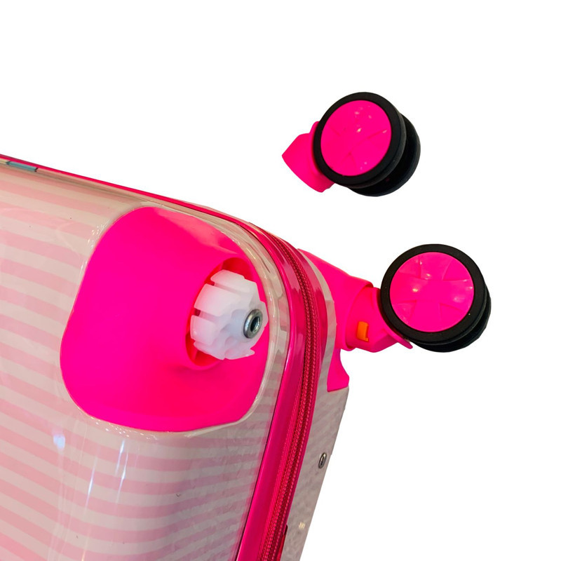 دسته تلسکوپی با قابلیت تنظیم ارتفاع، چرخ های جداشونده، چرخ های دوبل 360 درجه بسیار روان، قفل بدنه جهت زیپ های درب چمدان، سلفون ضخیم بر روی بدنه جهت محافظت بیشتر و آستر ساتن بسیار با کیفیت