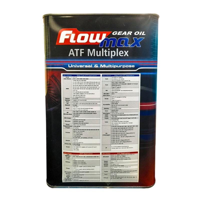 FLOWMAX ATF Multiplex سیال (روغن گیربكس )انتقال اتوماتیكی است كه با روغن های پایه كاملا سنتزی و با استفاده از افزودنی های ویژه به گونه ای فرموله شده است كه خواص اصطكاكی و قابلیت ضد ارتعاشی لازم در سرعتهای كم مطابق الزامات عملكردی در استاندارد های جهانی و سازندگان مطرح گیربكسهای اتوماتیك در سطح جهان را تامین نماید.