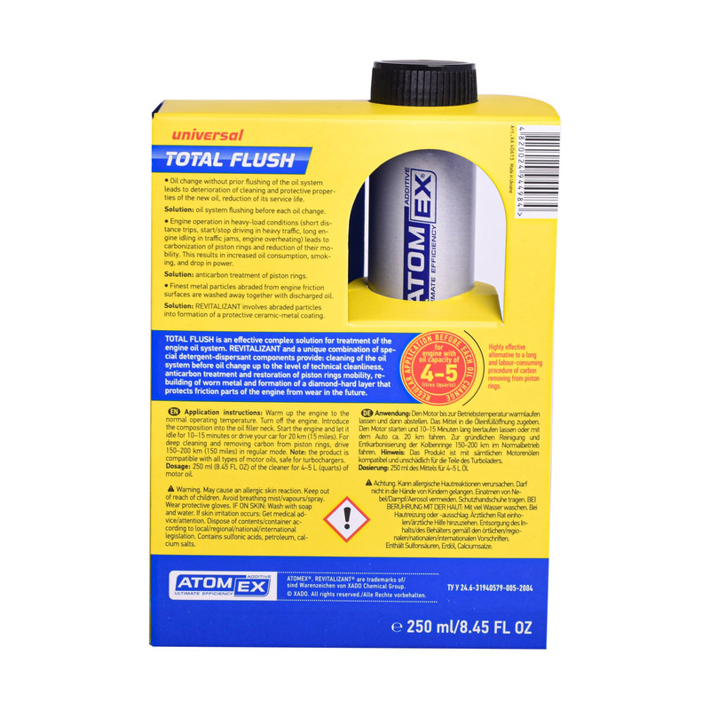 تعویض بهموقع روغن موتور برای اتومبیل شما لازم است اما این کار بهتنهایی نمیتواند عمر سرویسدهی موتور خودرو شما را افزایش دهد. راهحل در این است که برای رسیدن روغن به همه قسمتهای موتور شستوشوی دورهای سیستم روغن موتور انجام شود. موتور شوی اکسادو مدل Total Flush با نام تجاری «توتال فلاش اتمیکس» تمیزکننده سیستم روغن موتور است. این محصول با داشتن آنتیکربن و احیاگر (Revitalizant) برای بازسازی قطعات سایشی موتور، محصولی بسیار قدرتمند و مؤثر بهمنظور شستوشوی سیستم روغن موتور شناخته شده است. وجود احیاگر و ترکیب بینظیر تمیزکننده، سیستم روغن موتور را به سطح تکنیکال میرساند. آنتیکربن موجود در توتال فلاش باعث میشود، رینگ پیستون در صورت قفل بودن آنها آزادی عمل داشته باشد. همچنین احیاگر موجود در این محصول باعث ایجاد سطحی محافظ بر روی سطوح تحت سایش خواهد شد. از مزایای موتور شوی اکسادو مدل Total Flush میتوان به تمیزکنندگی بیخطر و بسیار قدرتمند موتور از هرگونه آلودگی، آزادکننده قفل رینگ پیستونها، مناسب برای همه نوع موتور حتی موتورهای دارای توربو شارژر، ایجاد لایه ضدسایش بر روی قطعات متحرک و تمیز کردن سیستم روغن تا سطح تکنیکال اشاره کرد.