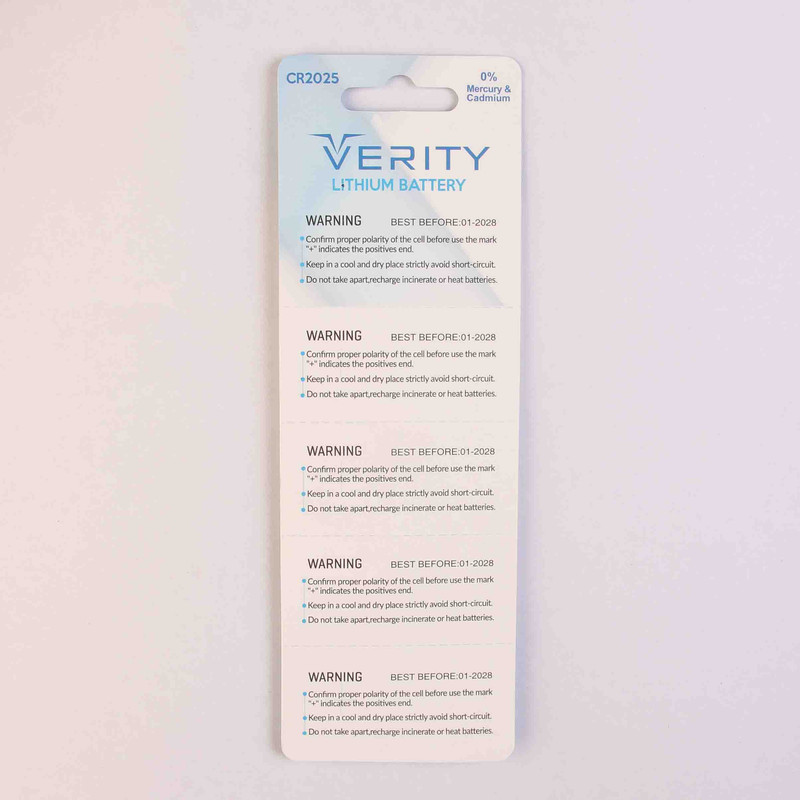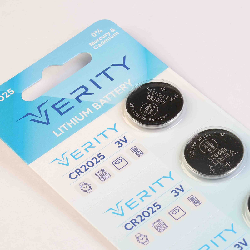 باتری لیتیومی CR2025 وریتی دارای بسته بندی اقتصادی و 5 عددی بوده و این باتری ها دارای ضخامت 2.5 میلی متر و قطر 20 میلی متر میباشند.این باتری ها در ریموت ظبط ها ، بعضی ترازوها و ... کاربرد دارد.