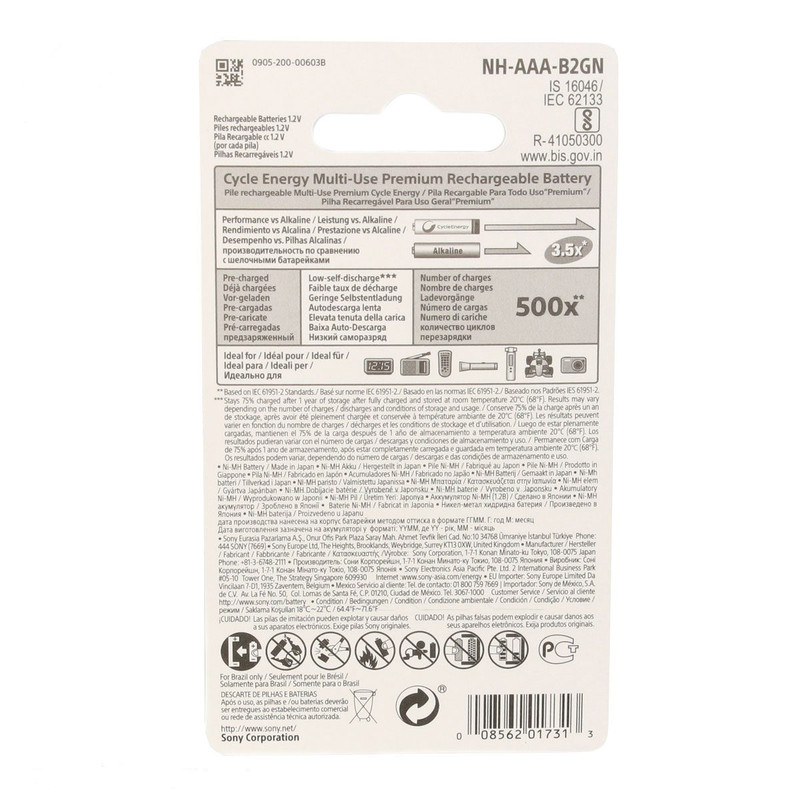 این سری باتری ساخت ژاپن از پیش شارژ شده و به هنگام باز شدن از بسته دیگر نیازی نیست که در شارژر قرار دهید,میتوانید مستقیم از آن ها استفاده کنید. هر باتری شارژی تعداد بار قابل شارژ شدن دارد که تعداد بار این سری باتری های سونی 500 میباشدقابل استفاده برای انواع تلفن فدربین رادیو چراغ قوه و وسایل پرمصرف میباشد.