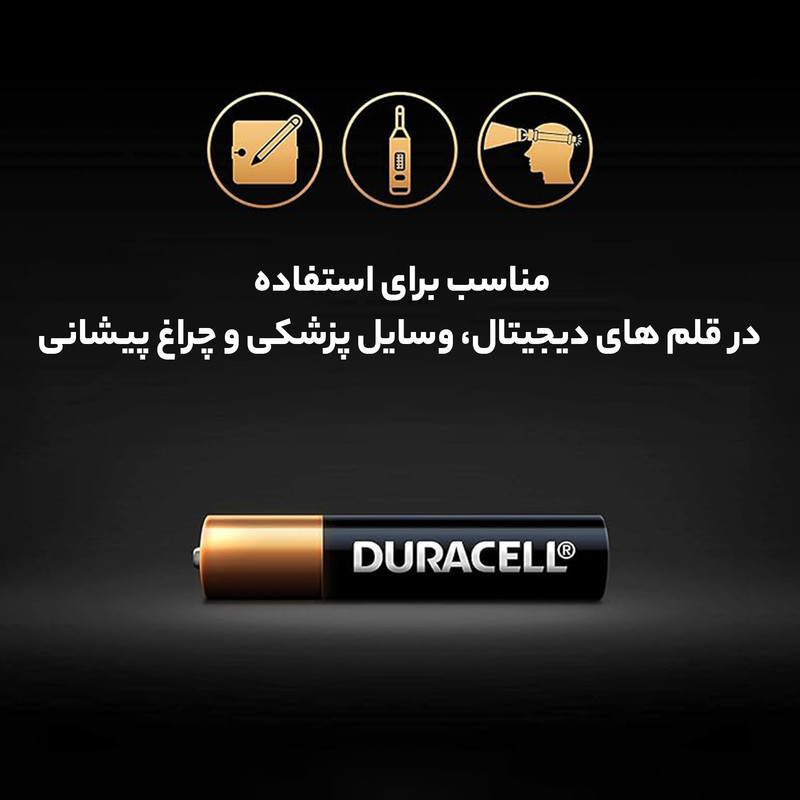 محصولی که در این قسمت شاهد هستید، بستهی 2 عددی باتری از نوع آلکالاین است که شرکت «دوراسل» آن را تولید کرده است. باتریهای آلکالاین (همان باتریهای قلیایی) نسبت به باتریهای معمولی، 4 برابر ظرفیت بیشتری داشته و جریان قویتری تولید میکنند. همچنین باتریهای آلکالاین دشارژ بسیار کمی داشته و تا زمان زیادی نیروی خود را حفظ میکنند. این باتریها در سایز AAAA طراحی شدهاند. سایز AAAA که به نامهای E96 و 25 هم شناخته میشود، در وسایل کوچکی مانند قلم سرفیس ،لیزر پوینتر، قلمهای نوری، دستگاه قند خون، دستگاه فشار خون، ریشتراش و... استفاده میشوند. برای آگاهی از سازگاری این محصول با دستگاه خود دفترچهی راهنمای محصول را مطالعه کرده و نسبت به آن اطمینان حاصل کنید.