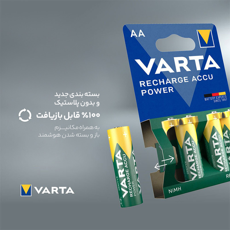 اطلاعات مندرج روی بسته بندی باتری قلمی شارژی وارتا شامل اندازه، ساختار شیمیایی، تاریخ انقضا و تکنولوژی ساخت باتری شارژی بوده که به منظور آگاهی مصرف کنندگان فراهم شده است.