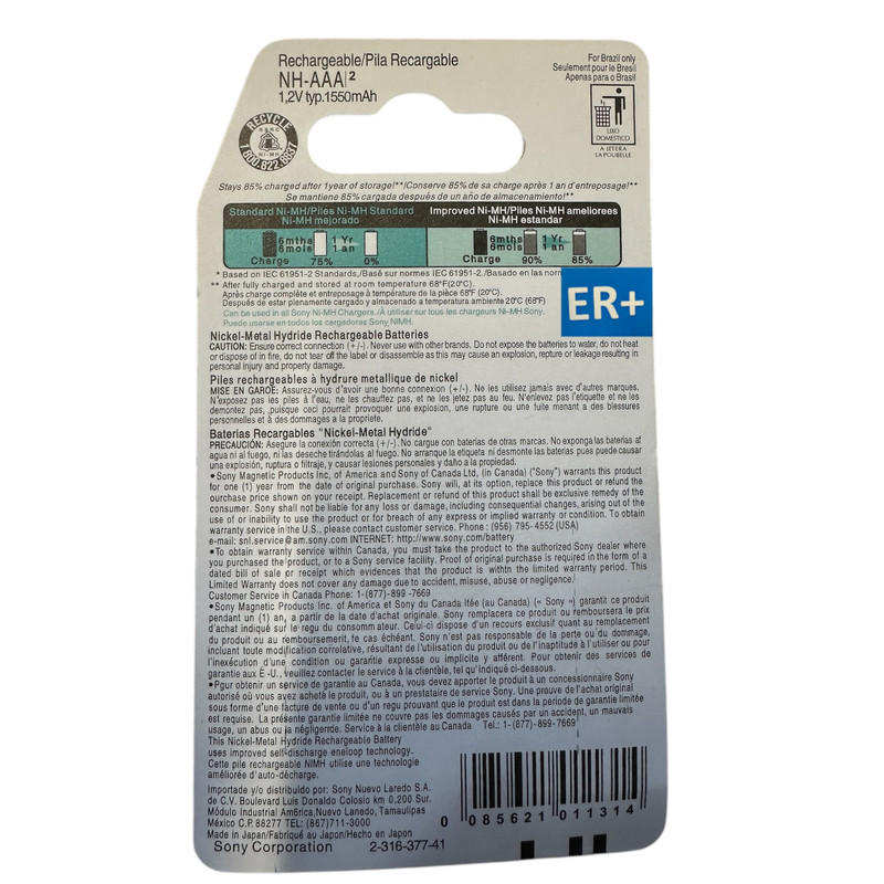 باتری سونی مدل+ER با ظرفیت 1550 میلی آمپر به طور خاص برای مطابقت با استانداردهای عملکرد تلفن های بی سیم ساخته شده اند. جایگزینی باتری های فرسوده با مجموعه جدیدی از باتری های تلفن بی سیم قابل شارژ هر چند سال ، حداکثر عملکرد تلفن را فراهم می کند. از کاربردهای مهم و فراوان باتری نیم قلمی سونی مدل +ER می توان به استفاده آن در تلفن های بی سیم ، دوربین های عکاسی و انواع اسباب بازی ها اشاره کرد. این باتری با ظرفیت 1550 میلی آمپر و عمر مفید 2 الی 3 سال بسیار مورد توجه افراد می باشد، شارژ اولیه ی باتری بسیار مهم می باشد و برای شارژ اولیه این باتری 12 الی 15 ساعت و برای دفعات دیگر بین 3الی 5 ساعت می باشد