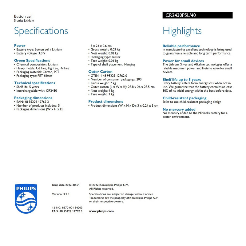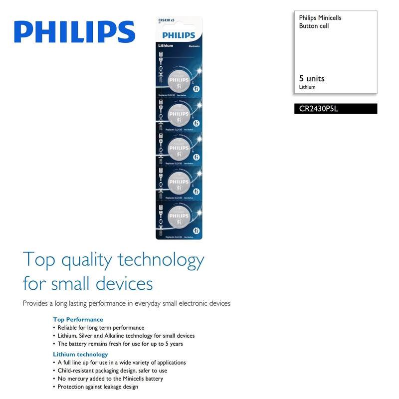 باتری سکه ای اریجینال فیلیپس مدل CR2430 با تکنولوژی لیتیومی ، یکی از قوی ترین باتری های سکه ای سری 2430 در بازار می باشد. شما با خرید باتری سکه ای مدل 2430 میتوانید از آن به عنوان باتری ساعت، باتری ماشین حساب، باتری دوربین، باتری تجهیزات کامپیوتری، باتری دزدگیر، باتری ریموت کنترل و بسیاری دیگر از تجهیزات الکترونیکی، دیجیتالی و… با تضمین کیفیت و طول عمر بالا استفاده کنید که با توجه به ظرفیت فوق العاده 270 میلی آمپر ساعتی این باتری، تا مدت ها نیاز به تعویض باتری نخواهید داشت. در صورت عدم استفاده، قابلیت نگهداری ذخیره انرژی برای بیش از 5 سال را دارا می باشد. حداقل تاریخ انقضای مصرف این باتری ها سال 2027 می باشد که بر روی کارت بسته بندی آن درج شده است.