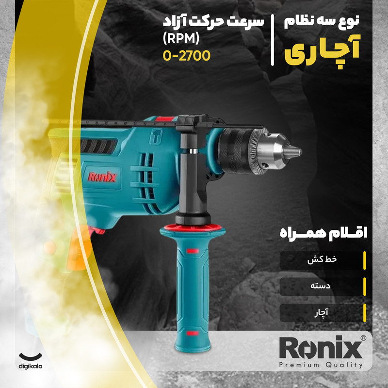 دریل چکشی 2211X رونیکس دارای یک موتور قدرتمند 750 واتی است که میتواند سرعتی بالغبر 2700 دور در دقیقه را ایجاد کند. این سرعت توسط کلید دیمردار کنترل سرعتی که در این ابزار تعبیه شده، قابل تنظیم است. همچنین با قابلیت چکشی در 2211X رونیکس، هیچ نگرانی در زمان سوراخکاری انواع مصالح نخواهید داشت. دامنه کاربری آن را بیشتر میکند. سهنظام 13 میلیمتری این دریل، تمامفلزی، مقاوم و از نوع آچاری است.