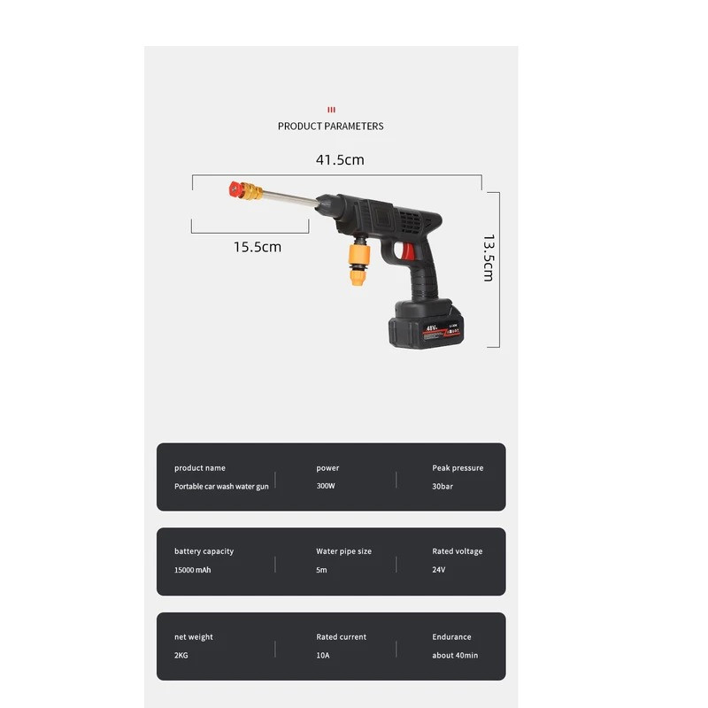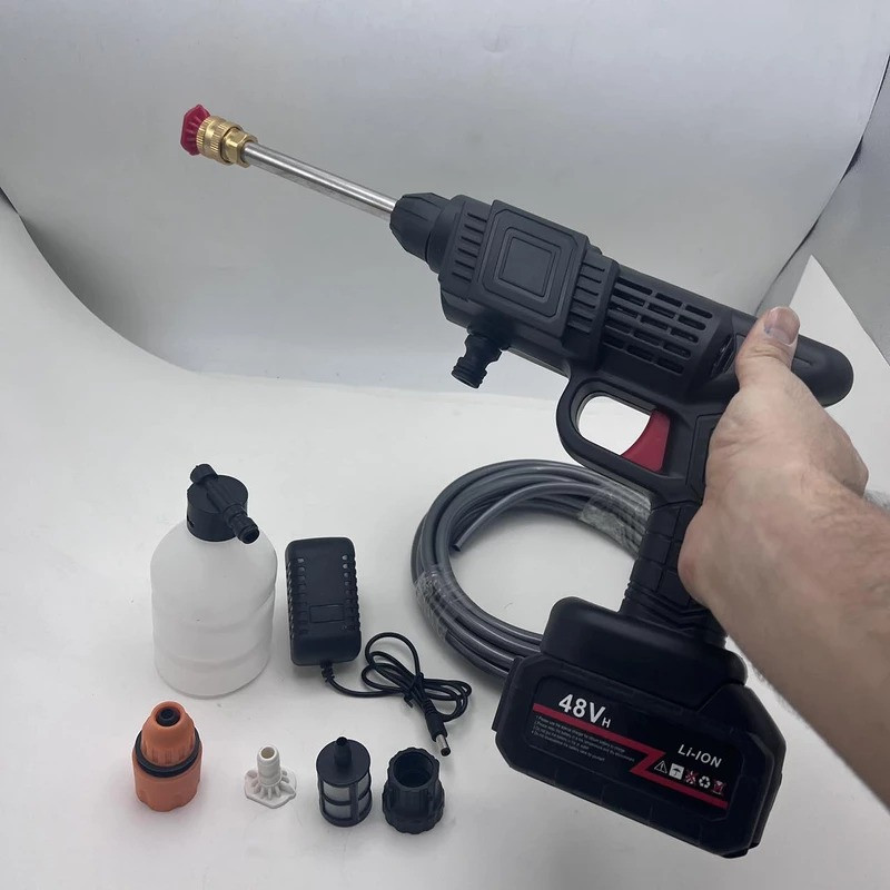 کارواش شارژی خانگی با دو عدد باطری 48 ولت لیتیومی با قدرت 300 وات است .حسن این دستگاه نسبت به دستگاه های دیگر این است که از سری های برنجی استفاده شده است که نشکن است ودر اثر فشار نمیشکند. حداکثر جریان خروجی سیالات در این کارواش 4 لیتر در دقیقه می باشد و فشار آب در بازه 22 تا 30 بار است. ویژگی کلیدی این کارواش قابلیت تنظیم فشار برای نیازهای مختلف است. از مهم ترین کاربردهای این کارواش می توان به مواردی مثل سمپاشی، تمیزکاری و آبیاری، شستشوی خودرو، پارکینگ، استخر، مبلمان، باغ، دوچرخه و … اشاره کرد. کارواش های شارژی یکی از اقلام ضروری برای در هر خانه به شمار می رود. طراحی این نوع کارواش ها به گونه ای است که بدون نیاز به آب فراوان یا حتی برق می توان از آن استفاده نمود. با استفاده این کارواش می توانید به راحتی و با صرفه جویی در مصرف آب، تنها با یک سطل آب، آبیاری سریع و پرفشاری را در منزل ، باغ ، زمین کشاورزی و … تجربه کنید. . فشار آب این کارواش خانگی در بازه 22 تا 30 بار قرار دارد که ویژگی قابل توجه این کارواش قابلیت تنظیم فشار آن است که می توانید با توجه به نیاز خود و آلودگی محل مورد نظر، آن راتنظیم نمایید. معمولاً فشارهای پایین برای آبیاری گیاهان و فشار بالا برای شستشوی وسایل نقلیه و … مورد استفاده قرار می گیرد. طول پاشش این کارواش تا 5 متر می باشد. باطری های قابل شارژ این کارواش نیز باعث در دسترس بودن همیشگی این کارواش حتی در مکان هایی که به برق دسترسی ندارید شده است.