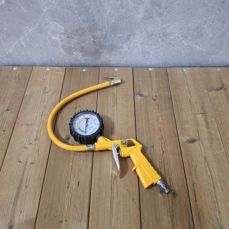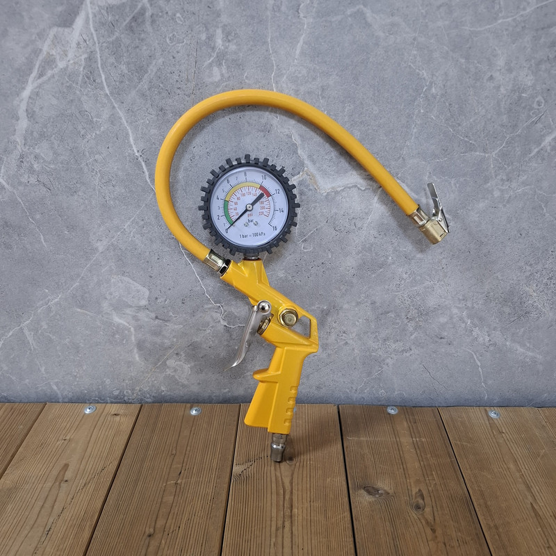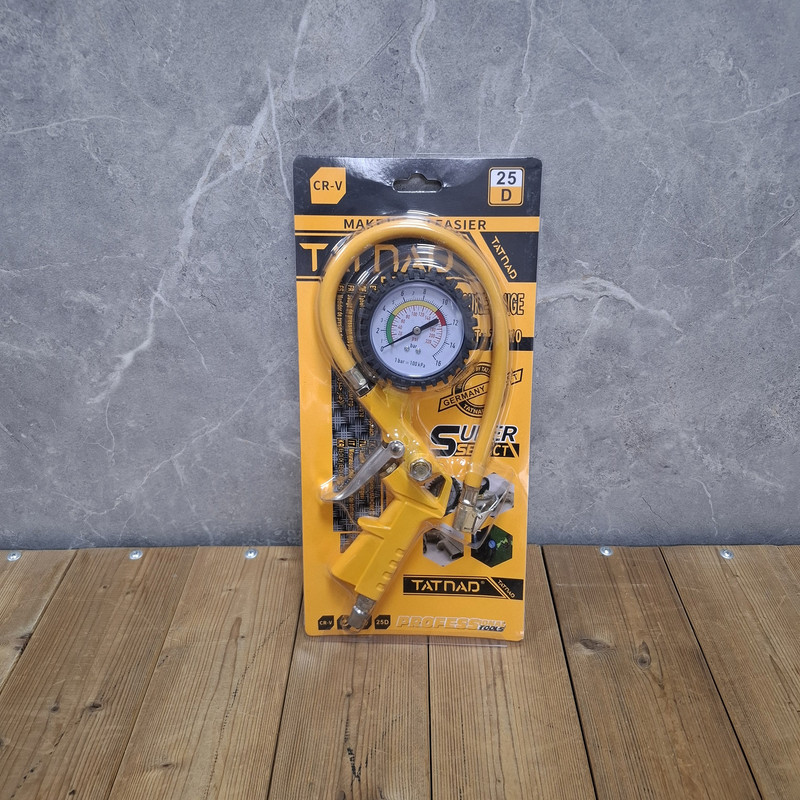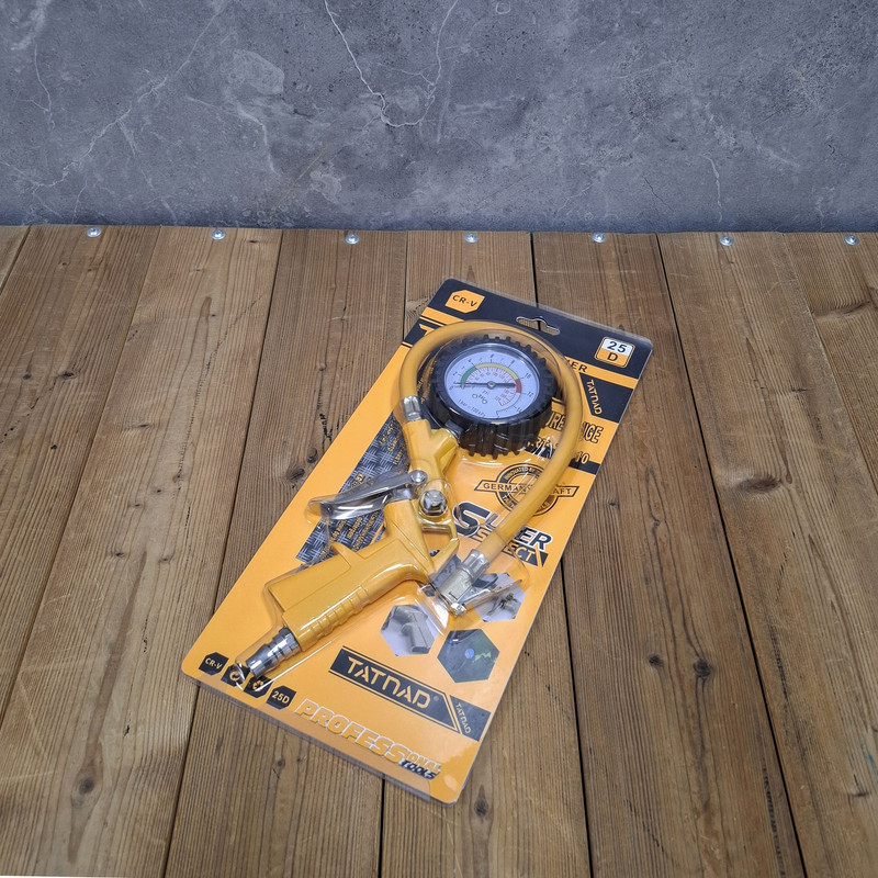 از ابزار پر کاربرد در دنیای امروزی میتوان به تفنگی باد تاتند جهت اندازه گیری میزان باد انواع تایر و یا باد کردن آنهاست. تفنگی باد گیج دار تایر (TATNAD) «تاتند» را ملاحظه میکنید. این تفنگی گیج دار تحت عنوان مدل (CR_V. 25D) به بازار عرضه شده است. این محصول امکان باد کردن و اندازه گیری فشار باد لاستیک و تیوپ های مختلف را دارد و قابل استفاده و اتصال به کمپرسورهای هوا است. این ابزار دارای گیج با قابلیت نمایش 0 تا 16 بار بوده و فشار کاری پیشنهادی آن 0 تا 4 بار است. همچنین این تفنگی دارای شلنگ با قابلیت انعطاف پذیری بالا و طول 36 سانتیمتر است. سایز اتصال ورودی این محصول یکچهارم اینچ است و دارای گیج دقیق با حساسیت بالا و مقاوم در برابر لرزش است. وزن بستهبندی این محصول 264گرم و ابعاد آن 12× 29× 2.5 سانتیمتر است.