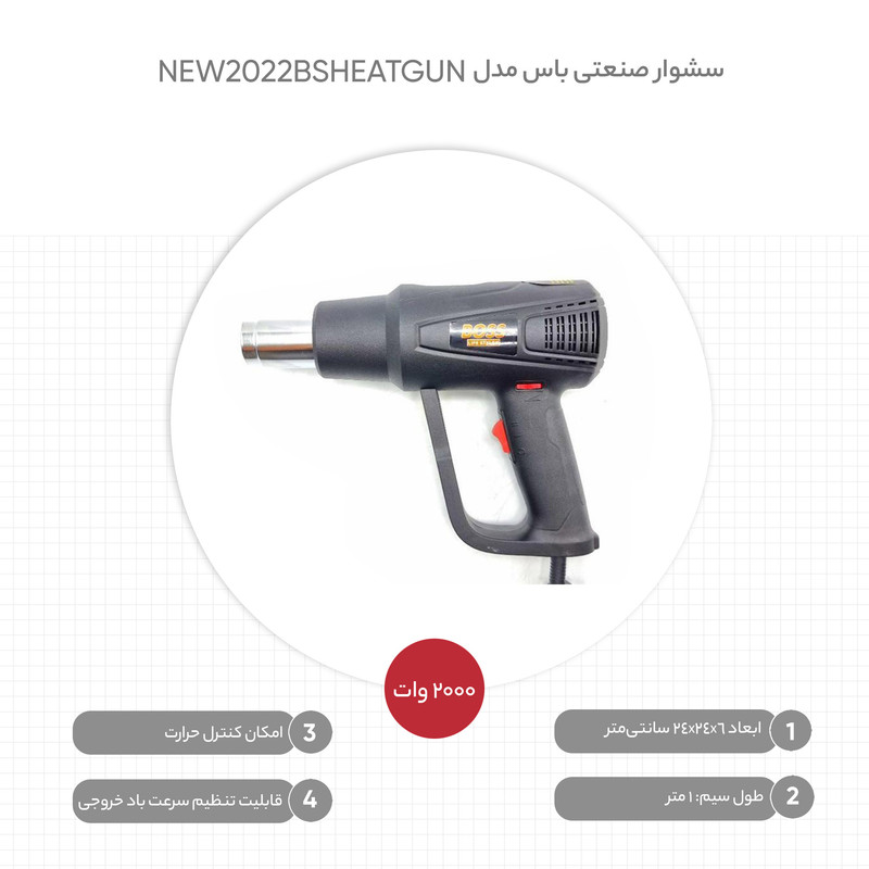 از سشوار صنعتی استفادههای گوناگونی در مشاغل مختلف میشود. ازجمله موارد استفادهی این دستگاه میتوان به خشککردن یا باز کردن چسبهای صنعتی، خشککردن رطوبت از سطوح و فرم دادن به برخی لوازم لاستیکی و پلاستیکی اشاره کرد. سشوار صنعتی دیمردار باس مدل BS_HEAT GUNیک سشوار صنعتی ساده اما با قدرت بالا است. این دستگاه با توان بالا و بهصورت ارگونومیک طراحی و ساخته میشود. وزن این دستگاه کمتر از 700 گرم است که در کنار دستهی ارگونومیک آن، باعث میشود تا کاربر احساس خستگی نکند. مدل BS_HEAT GUN باقابلیت تنظیم میزان سرعت باد خروجی (دیمردار)، دست کاربر را برای استفادهی صحیح و مناسب از این محصول باز گذاشته است. لازم به ذکر است که در زمان استفاده از دستگاه، هرگز نباید نازل آن را به سمت صورت یا پوست بدنتان بگیرید.