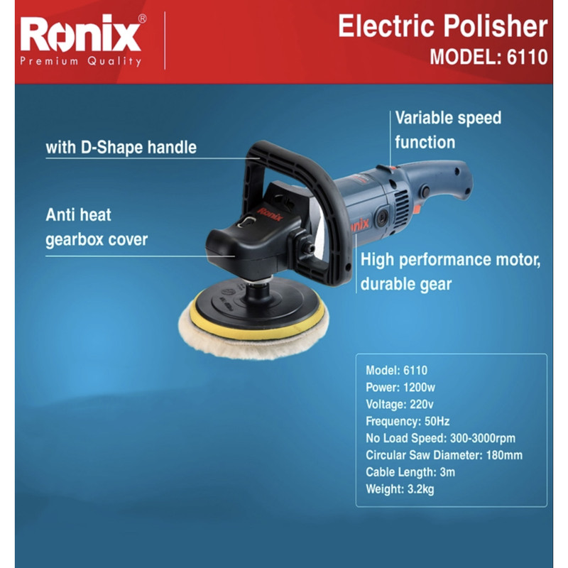 پس از تعمیر و رنگ سطوح فلزی، برای بهتر جلوه دادن این سطوح و براق کردن آنها از دستگاهی به نام پولیش استفاده میکنند. شرکت «رونیکس» (Ronix) یک مدل از این دستگاه را با نام 6110 تولید کرده است. این دستگاه با قدرت 1200 وات تولید میشود. این محصول دارای صفحهای از جنس آلومینیوم و با قطر 180 میلیمتر است. سرعت گردش این صفحه در حالت آزاد تا 3000 دور بر دقیقه میرسد. ویژگی این مدل در کنترل و تنظیم سرعت دستگاه است؛ یعنی علاوه بر مجهز بودن دستگاه به دیمر (کنترل سرعت با فشار بر روی کلید دستگاه)، قابلیت تنظیم سرعت در 6 حالت مختلف را دارد.