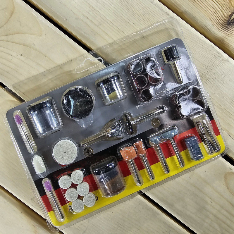 ساب و سنباده صفحه ای و سنباده رولی و انگشتی فلزی و انگشتی سنگی و روغن و فرچه پلاستیکی و سیمی در یک مجموعه کامل می باشد