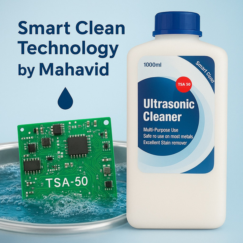 محلول کلینر آلتراسونیک TSA-50 حجم یک لیتری برای شستشوی کیتهای الکترونیکی و بردهای مدار چاپی و به طور خاص برای حذف آلودگیها و جرمهای مختلف از سطح بردهای الکترونیکی و اجرای الکترونیکی مناسب می باشد.