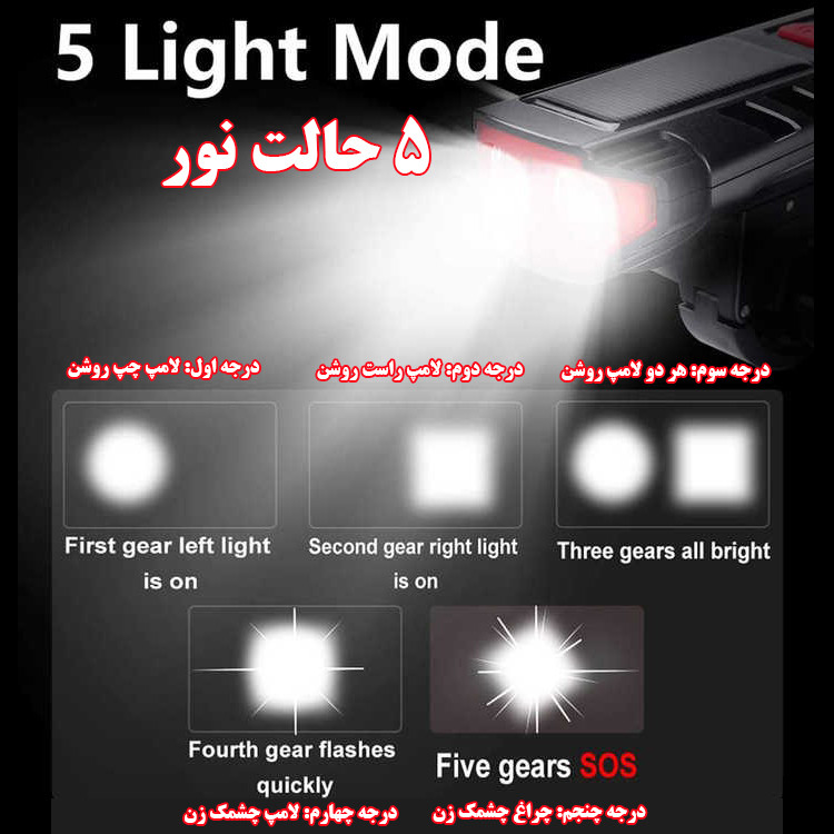 این چراغ دوچرخه چندکاره، یک همراه ایدهآل برای دوچرخه سواری ایمن و لذتبخش است. با طراحی ضد آب و گرد و غبار، این چراغ در هر شرایط آب و هوایی قابل استفاده است و شما میتوانید با خیال راحت در باران و گرد و خاک دوچرخه سواری کنید. مجهز به پنل خورشیدی است که با نور خورشید شارژ میشود و نیاز به تعویض باتری را کاهش میدهد و باعث صرفهجویی در مصرف برق میشود. این چراغ دارای پنج حالت نوردهی مختلف است؛ از جمله نوردهی چپ، نوردهی راست، نوردهی کامل، نور چشمک زن سریع و حالت SOS برای شرایط اضطراری.
