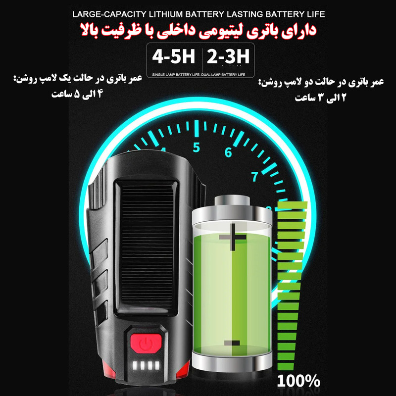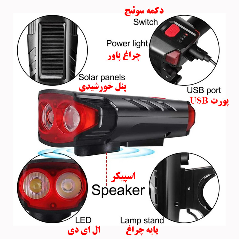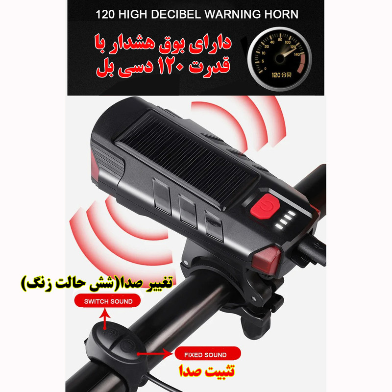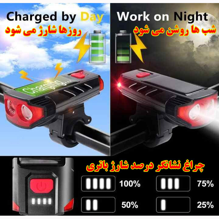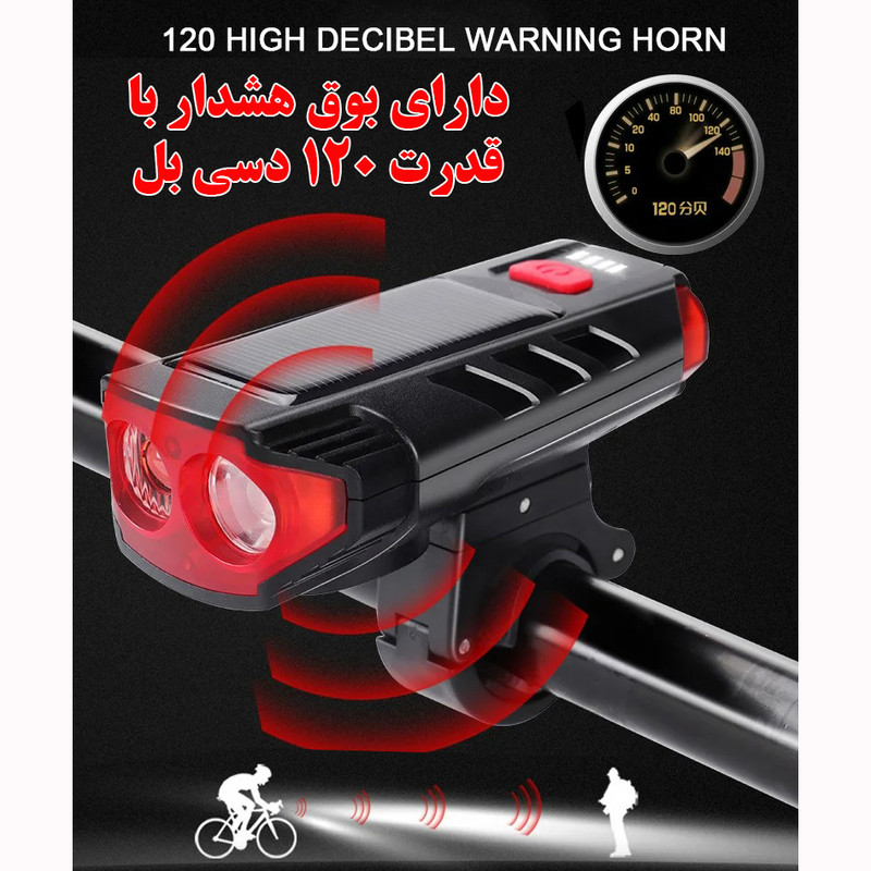 با توان نوری 600 لومن، این چراغ روشنایی فوقالعادهای را در شب فراهم میکند و برد نوری 100 تا 250 متر دارد که به شما امکان دید واضحتری از مسیر پیش رو را میدهد. همچنین دارای یک بوق هشدار با صدای 120 دسیبل است که به شما کمک میکند تا در خیابان و جادهها ایمنتر باشید. این چراغ با باتری لیتیومی 2000mAh کار میکند که تا 4 ساعت نوردهی مداوم را تضمین میکند. علاوه بر پنل خورشیدی، این چراغ قابلیت شارژ از طریق پورت USB را نیز دارد که در مواقع ضروری بسیار کاربردی است.