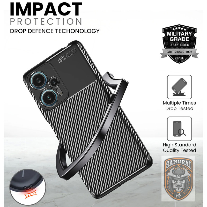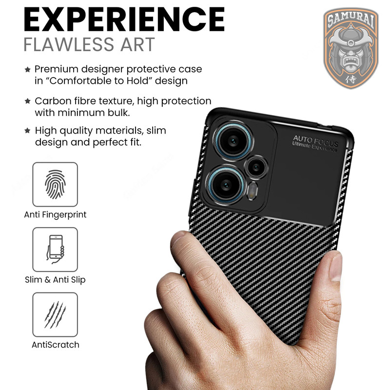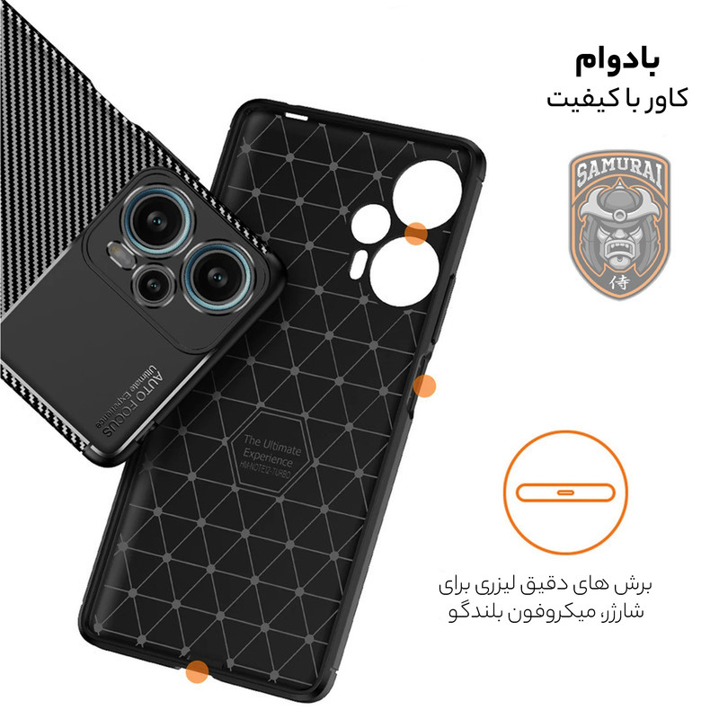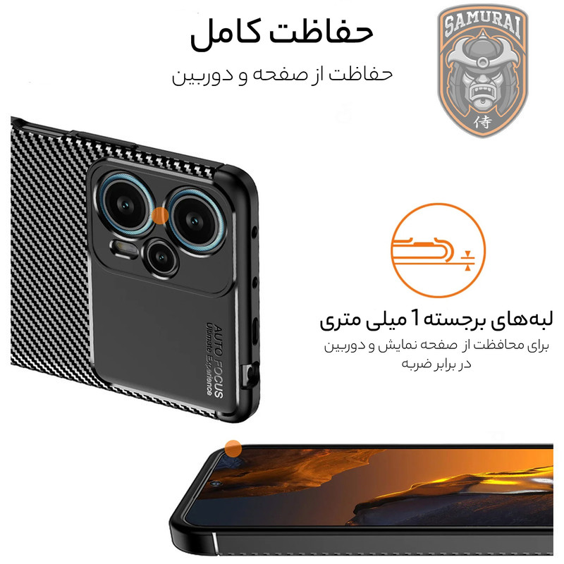 سری Auto Focus از قاب های شرکت Samurai از فیبر کربن پیشرفته ساخته شده، که دارای جنسی مقاوم و ضد آب است. پروسه تولید این محصول به نحوی بوده است که کیفیت این محصول را تضمین می کند. از دیگر ویژگی های منحصر به فرد این سری قاب می توان به شیار های ظریف به کار رفته در آن و همچنین کم وزن بودن آن اشاره کرد. این قاب در عین مقاومت بالا، از جنس نرم قابل توجهی برخوردار است به طوری که فریم های TPU منعطف آن در مقابل خط و خش و ضربه مقاوم هستند و از دورتادور گوشی شیائومی Xiaomi Poco F5 / Redmi Note 12 Turbo محافظت می کند. این قاب حاصل تزریق دوگانه فیبر کربن و استفاده از فرآیند تولید دقیق و پیچیده ای است که در نتیجه آن قابی با یک بافت هندسی منظم و ظریف تولید شده است که سادگی چشمگیر و سبکی منحصر به فردی به گوشی می دهد. قاب فیبرکربن تحت فشار زیادی در فرآیند گرمایی پیشرفته ای قالب گیری شده است که منجر به ادغام فیبر کربن بافته شده با پوسته پشت قاب از جنس پلی پروپیلن شده است. سطح این قاب در فرآیند تولید با به کارگیری فناوری اسپری روغن لاستیک تولید شده است که باعث می شود تا سطح این قاب نمایی مات و براق داشته باشد و همچنین اثر انگشت به راحتی هر چه تمام تر از روی این قاب پاک شود. قالب گیری کاملا مکانیزه در تولید این قاب باعث شده است تا شکاف های تعبیه شده در این قاب کاملا با بدنه گوشی شیائومی Xiaomi Poco F5 / Redmi Note 12 Turbo مطابقت داشته باشد به طوری که پورت ها و دیگر اجزای گوشی موبایل هم تراز هستند و این ویژگی ها باعث می شود تا کاربر حس کند که تمامی قابلیت های تلفن همراه تحت کنترل او قرار دارد. همچنین روی دکمه برای محافظت در برابر گرد و غبار پوشانده شده است.