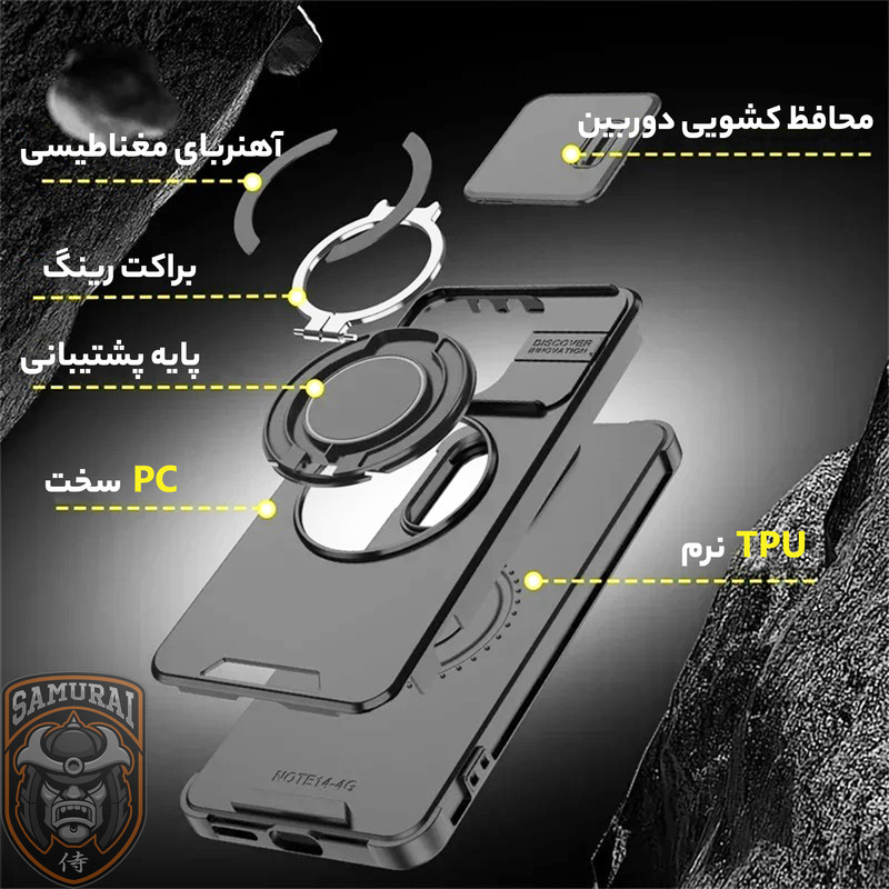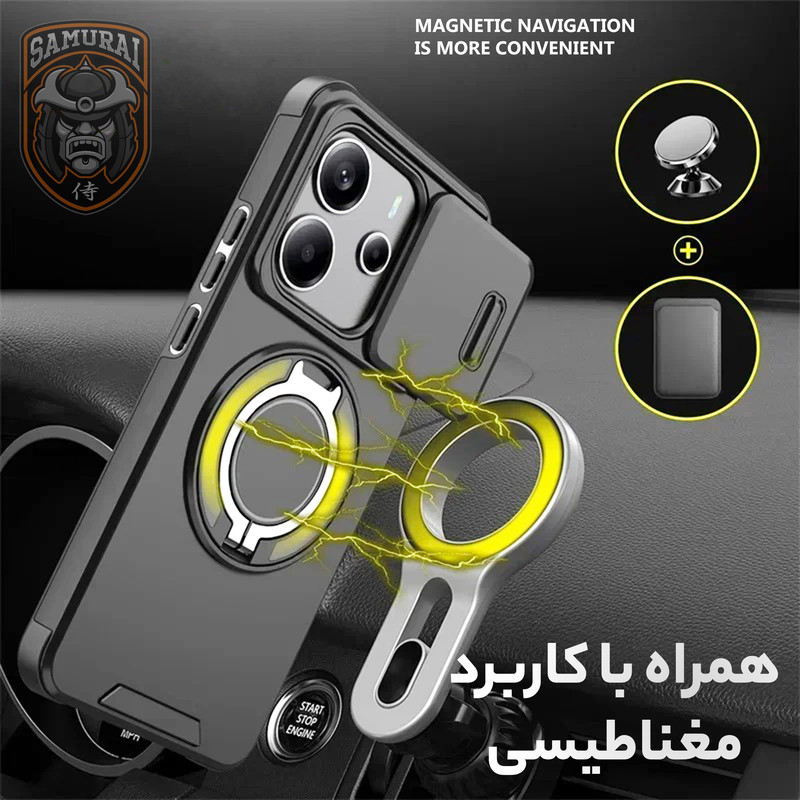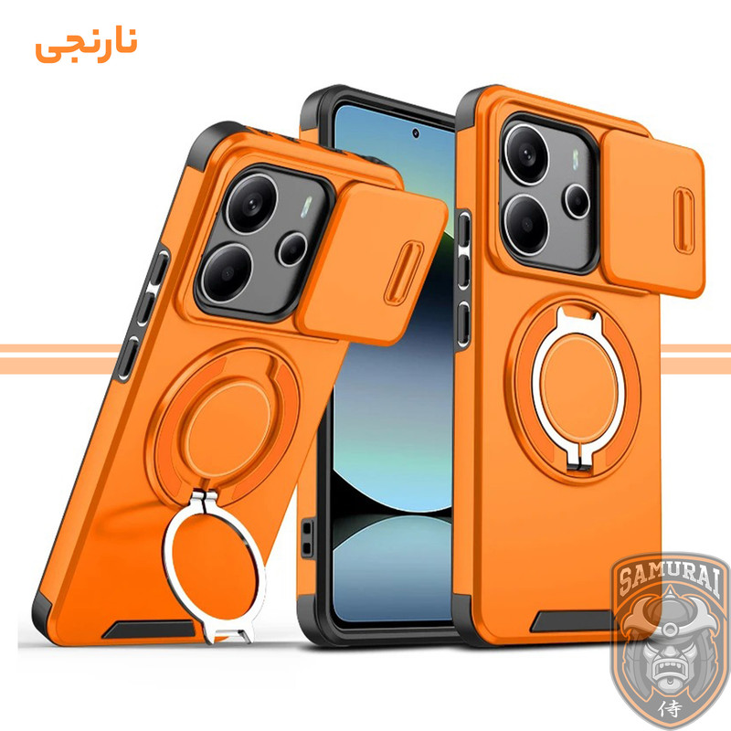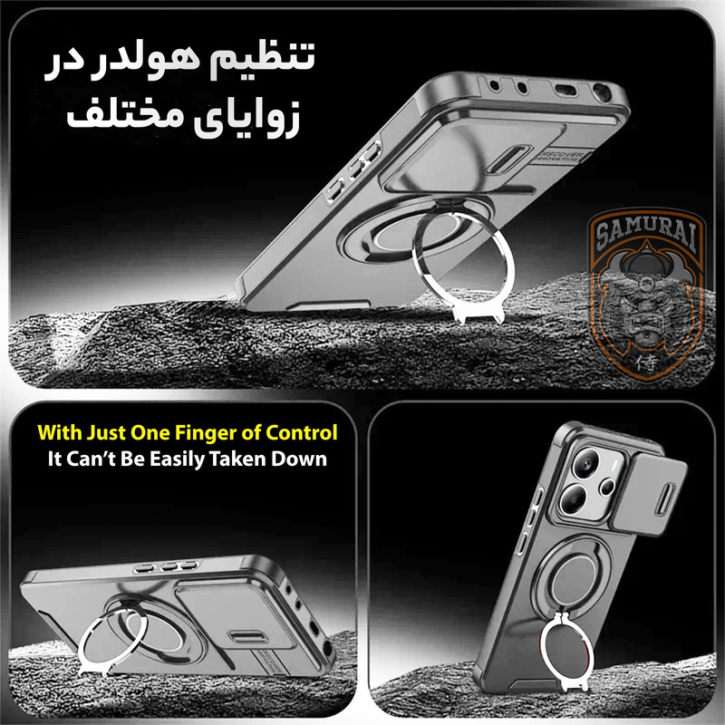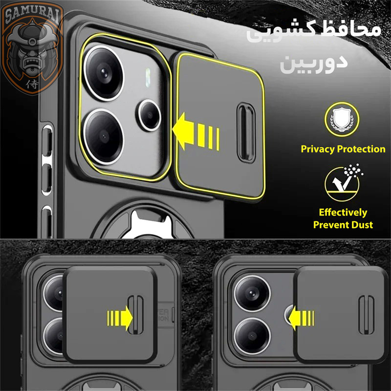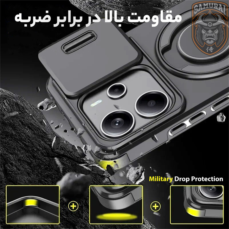 قاب شیائومی Redmi Note 14 مدل Eros از برند سامورایی ترکیبی از طراحی هوشمند و قابلیتهای کاربردی برای محافظت کامل گوشی می باشد. هولدر مغناطیسی مجهز به فناوری مگسیف امکان اتصال سریع و ایمن را فراهم میکند و با قابلیت چرخش ۳۶۰ درجه و تنظیم در زوایای مختلف، بهترین زاویه دید را برای تماشای فیلم یا کار با گوشی ارائه میدهد. محافظ کشویی دوربین، لنز را از خط و خش، گرد و غبار و ضربه محافظت میکند و به راحتی قابل باز و بسته شدن است. مقاومت بالا در برابر ضربه، این قاب را به انتخابی ایدهآل برای استفاده روزمره تبدیل کرده است، در حالی که طراحی باریک و سبک آن، استفاده راحت و بدون مزاحمت را تضمین میکند. اگر بهدنبال یک قاب مقاوم و کاربردی هستید، این گزینه برای گوشی Xiaomi Redmi Note 14 بهترین انتخاب است.
