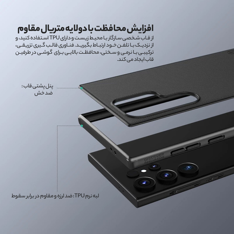 هرکس که بهترین را داشته باشد، بهترین ها را در کنار خود جمع میکند، غول و پرچمدار جدید سامسونگ نیز بهترین های لوازم جانبی را طلب میکند و مهم ترین آن ها قاب گوشی است و چه برندی نام آشنا تر از نیلکین !؟ کاور «نیلکین» مدل «Super Frosted Shield Pro» برای گوشی موبایل سامسونگ Galaxy S24 Ultra طراحی و تولید شده است. این محصول با استفاده از پلیکربنات ساخته شده و مقاوم است. سطح کاور بهصورتی طراحی شده که در برابر لغزش و سایش مقاومت دارد. بنابراین در زمان استفاده از گوشی موبایل احتمال لیز خوردن و افتادن دستگاه از دستتان به حداقل خواهد رسید؛ همچنین لایهی رویی این محصول اثرانگشت کمی به خود جذب کرده و مدت زمان بیشتری میتوان آن را تمیز نگه داشت.محل قرارگیری درگاهها در این محصول بهطور دقیق اندازهگیری شدهاند تا دسترسی و استفاده از آنها بدون مانع انجام شود. این کاورتمامی سطوح گوشی موبایل را میپوشاند و از دستگاه شما در برابر خط و خش محافظت میکند. این کاور لبههای باریکی دارد و از نمای جلو، تغییر چندانی در ظاهر گوشی ایجاد نمیکند؛ همچنین وزن آن کم است تا بدون نگرانی بهخاطر تغییر وزن و ابعاد گوشیتان از آن استفاده کنید؛. این قاب پشت و لبه های گوشی سامسونگ اس 24 الترا را پوشش می دهد و از بروز مشکلاتی قبیل خط و خش و ضربه جلوگیری می کند. کاوری که شیار های موربی دارد که باعث می شود گوشی از دست و از روی سطح به هیچ عنوان لیز نخورد.بنابراین اگر به دنبال محافظی با کیفیت ساختاری بالا هستید قاب نیلکین Samsung Galaxy S24 Ultra مدل Frosted Shield Pro را به شما پیشنهاد می کنیم،نصب و جداسازی این کاور از گوشی سامسونگ اس 24 الترا بسیار ساده و راحت است و محدودیتی در دسترسی به پورت ها و لنز دوربین ایجاد نمی کند. روی دکمه ها برای محافظت بهتر پوشیده شده اند.قسمت پورت ها و رابط های کاربری توسط برش های دقیقی باز است تا کاربر بتواند به راحتی از آن ها استفاده کند،همچنین قاب Samsung Galaxy S24 Ultra در قسمت دوربین پشت ضخامتی بیشتر از جاهای دیگر دارد که این موضوع باعث می شود با قرار دادن گوشی سامسونگ اس 24 الترا دوربین سطح تماس کم تری با سطوح مختلف داشته و از این رو کم تر در معرض خط و خش و ضربه دیدن قرار می گیرد.