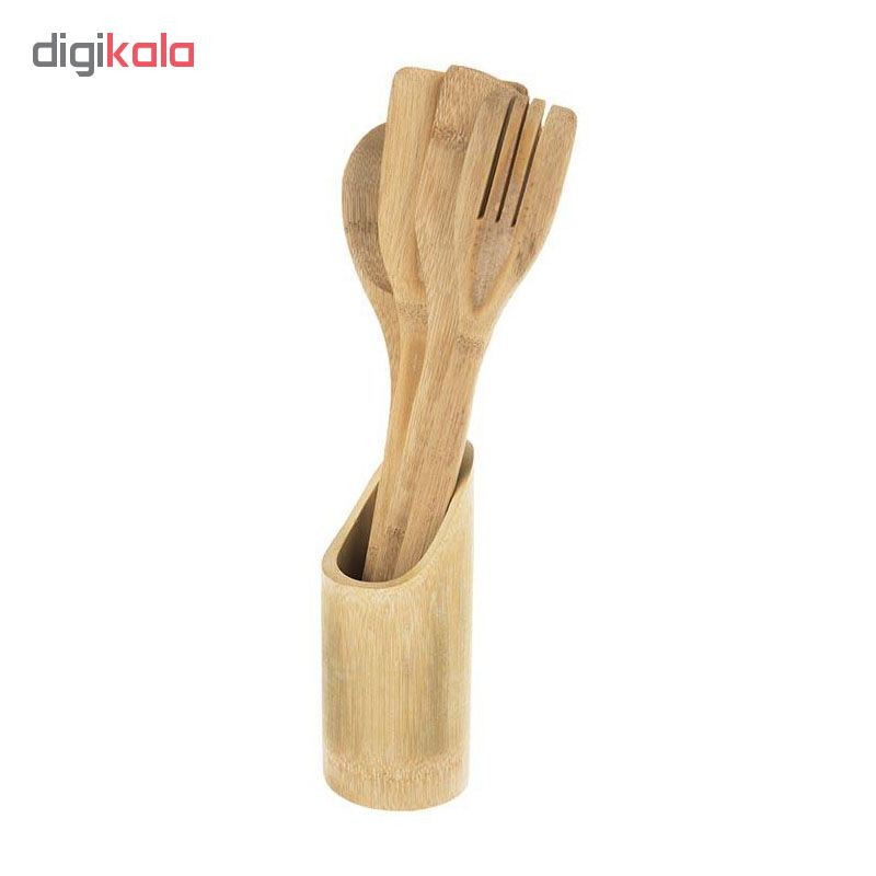 ست 5 پارچه شامل 2 عدد کفگیر، چنگال و قاشق کفگیر به طول 30.5 سانتیمتر چنگال بهطول 30 سانتیمتر قاشق بهطول 38.5 سانتیمتر ابعاد استند: طول 7.5، عرض 6.5 و ارتفاع 16 سانتیمتر
