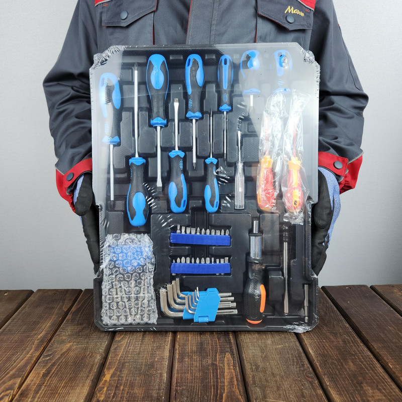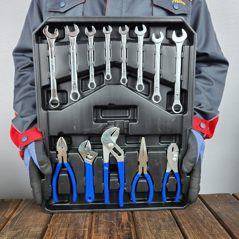 دارای 2 عدد انبر تنگدستی کوچک، دارای یک عدد ست پیچ و رول پلاک، یک عدد متر سه متری، یک عدد تراز، یک عدد چکش میخ کش، یک عدد کاتر، یک عدد قیچی، یک عدد پرس دستی کابلشو، یک عدد تفنگ حرارتی، دو عدد چسب تفنگ حرارتی، بکس 1/2 در سایزهای 8, 9, 10, 11, 12, 13, 14, 15, 16, 17, 18, 19, 20, و دارای بکس 1/4 در سایزهای 4, 4.5, 5, 5.5, 6, 7, 8, 9, 10, 11, 12, 13, 14 یک عدد کشویی 1/4 و یک عدد کشویی 1/2 یک عدد رابط کوتاه 1/2 (12.5 سانتیمتر) دو عدد بکس شمعی در سایزهای 16 و 21 یک عدد لغلغه 1/2 و یک عدد لغلغه 1/4 دو عدد رابط 1/4 در سایزهای 5 و 10 سانتیمتر یک عدد جغجغه 1/2 و یک عدد جغجغه 1/4 یک عدد رابط فنری 1/4 (15 سانتیمتر) یک عدد پیچگوشتی 1/4 یک عدد انبردست یک عدد انبر دم باریک یک عدد انبر کلاغی یک عدد آچار فرانسه یک عدد سیم چین چند عدد آچار در سایزهای 6, الی 16, دو عدد پیچگوشتی فشار قوی (برق) دو سو و یک عدد چهار سو یک عدد پیچگوشتی دو سو مچی و یک عدد پیچگوشتی چهار سو مچی 5 عدد پیچگوشتی چهار سو و 4 عدد پیچگوشتی دو سو یک عدد ست پیچگوشتی ساعتی یک عدد فازمتر چند عدد بیت در انواع ستاره ای، ششگوش، چهار سو و دو سو یک عدد ست آچار آلن یک عدد پیچگوشتی جغجغه ای یک عدد رابط بیت می باشد.
