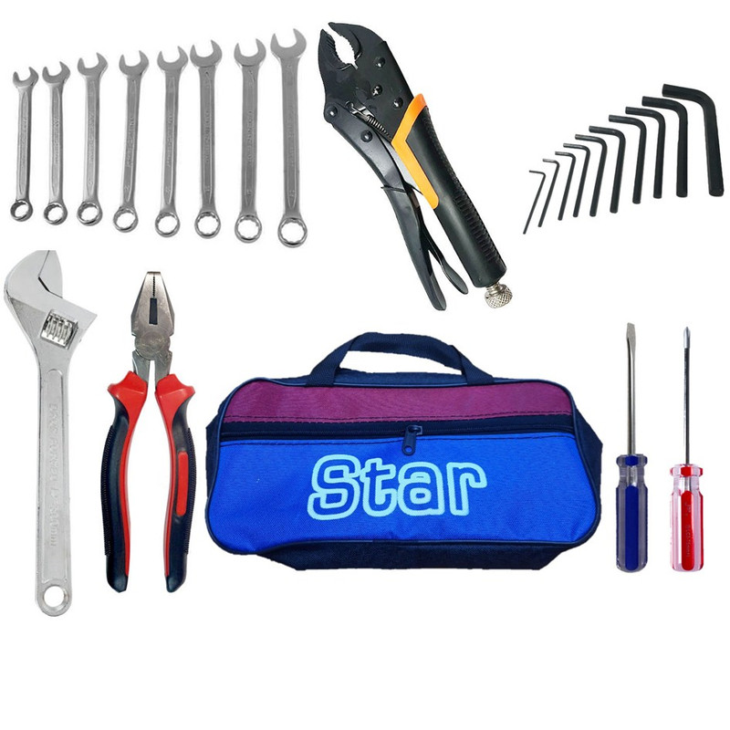 محتویات مجموعه: آچار آلن , آچار فرانسه , آچار یکسر تخت یکسر رینگی , انبر قفلی , انبردست , پیچ گوشتی , کیف ابزار